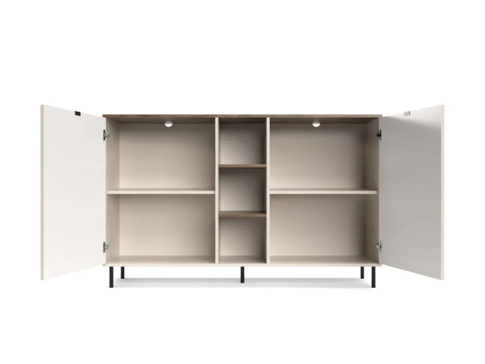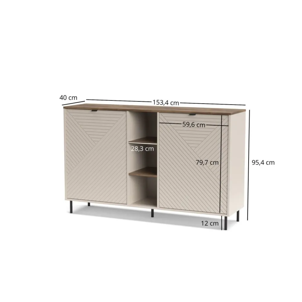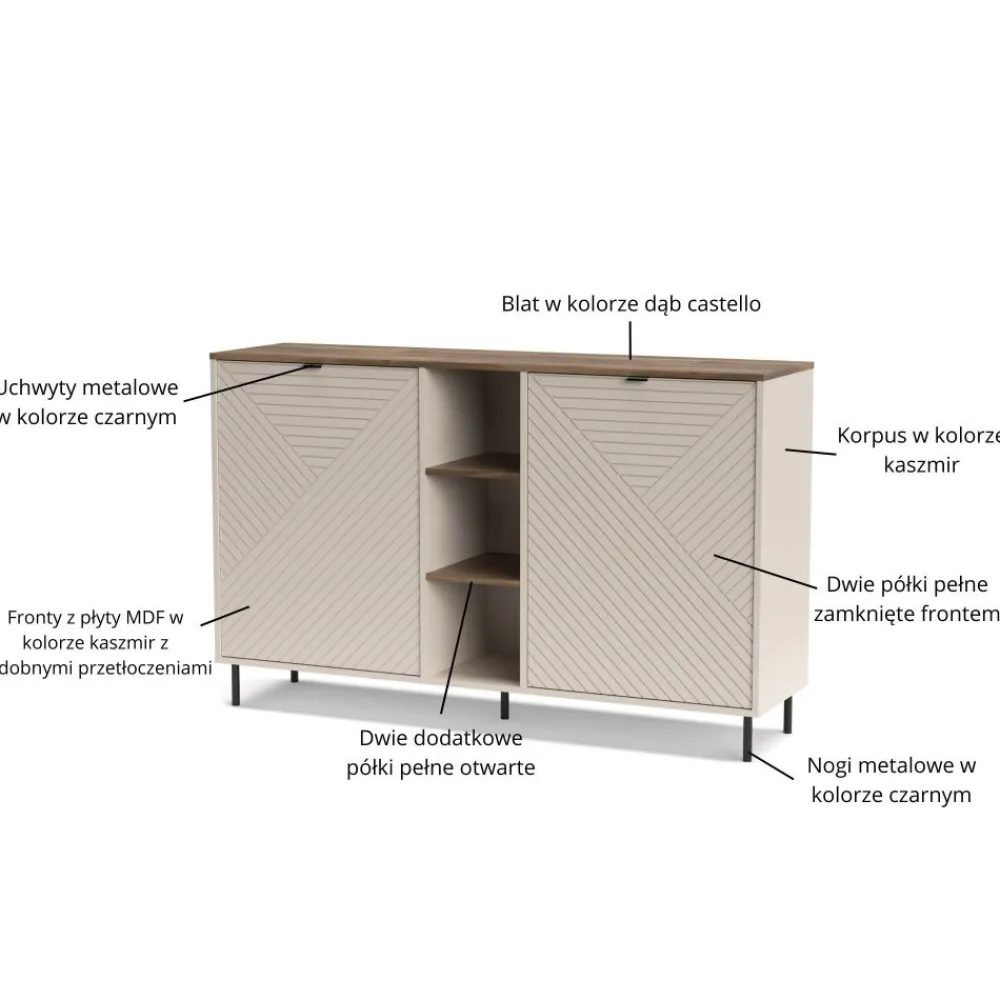 Komoda do salonu EVO EO-03 2D wyróżnia się wyjątkowym designem, który przyciąga uwagę swoją elegancją i dbałością o detale. Kolor korpusu w odcieniu kaszmiru harmonizuje z blatem o barwie dąb castello, tworząc ciepły i przytulny klimat w pomieszczeniu. Ryflowane fronty z płyty MDF nadają meblowi unikalny charakter, wprowadzając do wnętrza nowoczesny, a zarazem ponadczasowy styl. Dzięki swojej wysokości, komoda staje się dominującym elementem wystroju, dodając wnętrzu klasy i wyrafinowania. Jest to idealne rozwiązanie dla osób ceniących sobie nie tylko funkcjonalność, ale również estetykę na najwyższym poziomie. Taki mebel z pewnością stanie się ozdobą każdego wnętrza, wprowadzając do niego odrobinę luksusu.