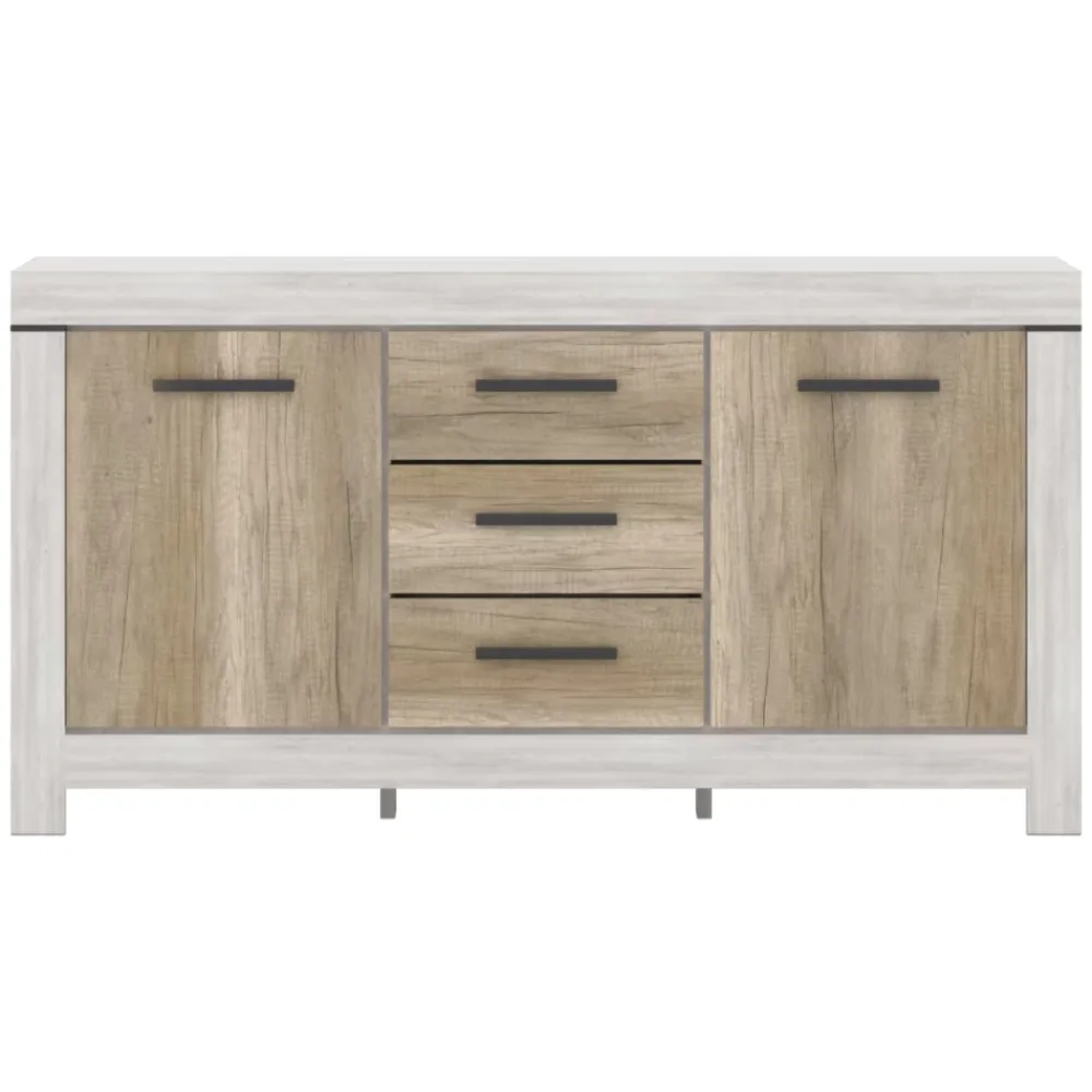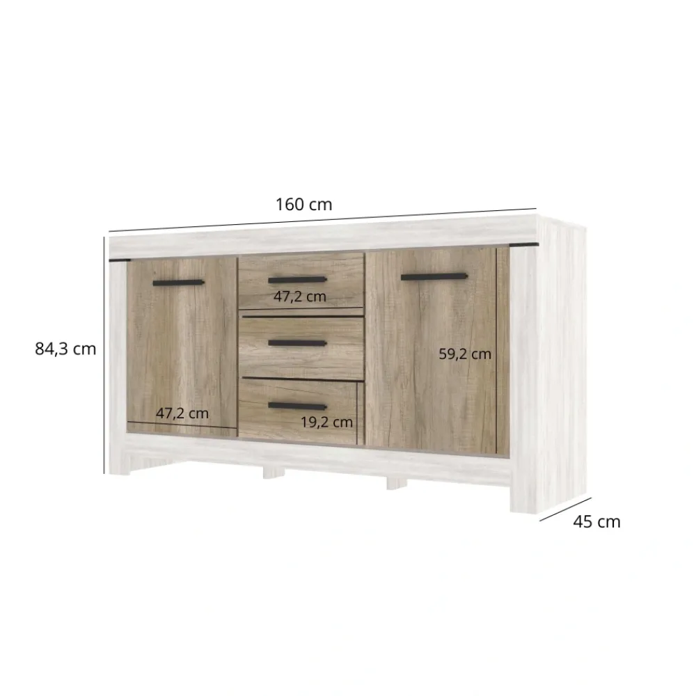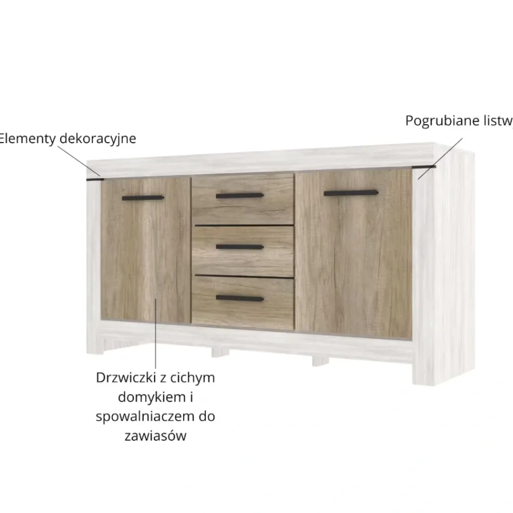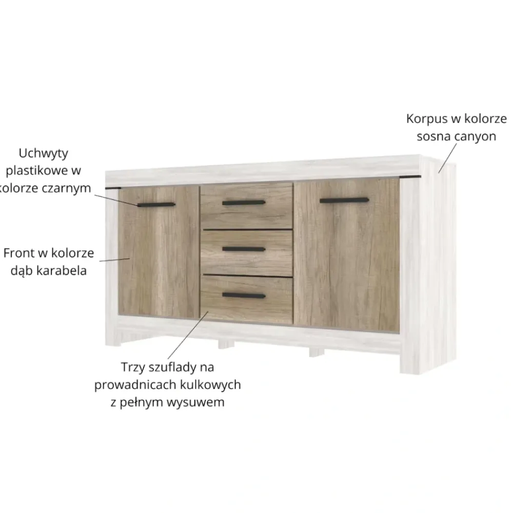 Komoda Belen 3D2S o szerokości 160 cm i wysokości 84 cm to idealne rozwiązanie dla osób, które poszukują eleganckiego, a zarazem praktycznego mebla do przechowywania. Zestawienie korpusu w dekorze sosna canyon z frontami w odcieniu dąb karabela tworzy ciepłą i naturalną kompozycję, doskonale wpisującą się w nowoczesne i klasyczne wnętrza. Solidna konstrukcja została wzbogacona o pogrubione listwy boczne, dolne i górne, które nadają komodzie masywniejszy, bardziej wyrazisty charakter.