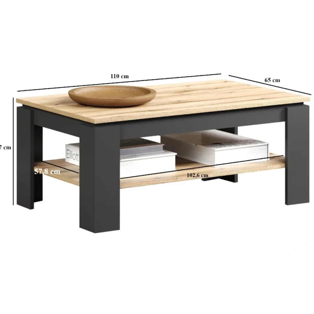 Ława Esteban łączy elegancki design z funkcjonalnością, dzięki czemu idealnie dopełnia nowoczesne wnętrza salonów i pokojów dziennych. Zestawienie kolorystyczne grafit i dąb evok dodaje wnętrzu stylu, przytulności i wyrazistego charakteru. Wymiary 110 × 65 × 47 cm sprawiają, że stolik świetnie sprawdza się zarówno przy codziennym odpoczynku, jak i spotkaniach z gośćmi. Prostokątny blat wykonany z laminowanej płyty meblowej jest odporny na zarysowania i łatwy w czyszczeniu. To idealne rozwiązanie dla osób ceniących trwałość i nowoczesny design.