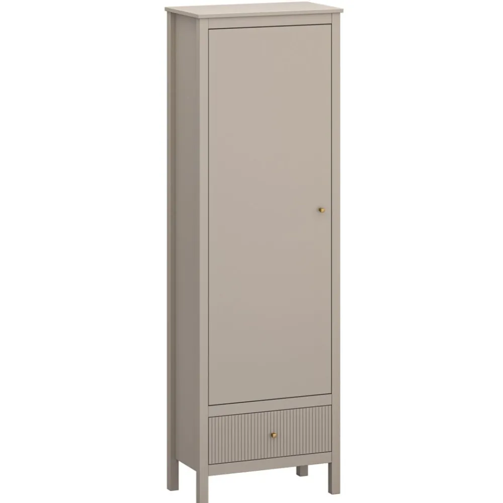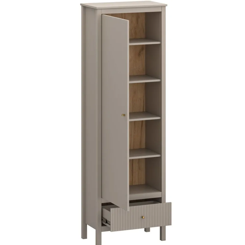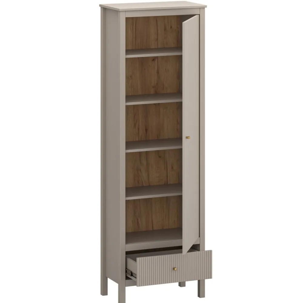 Ten regał do jadalni to idealne rozwiązanie, które łączy w sobie styl i funkcjonalność, doskonale pasując do nowoczesnych wnętrz. Wyposażony w jedną szafkę i szufladę z ryflowanym frontem, regał oferuje dużo miejsca do przechowywania zastawy, obrusów czy dekoracji. Pięć półek wewnątrz szafki pozwala na uporządkowanie wszystkiego, co jest niezbędne w jadalni, a jednocześnie utrzymanie porządku i estetyki. Kolor taupe oraz złote uchwyty podkreślają elegancki charakter mebla, wprowadzając do wnętrza subtelny luksus. Dzięki możliwości montażu drzwi na lewą lub prawą stronę, regał jest bardzo wszechstronny i można go dostosować do swoich potrzeb.