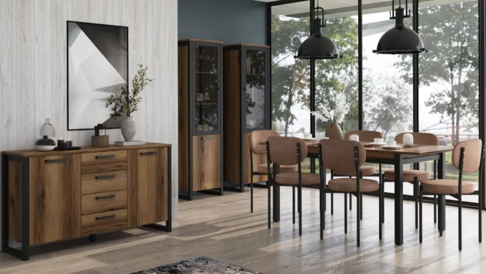 Mares, to kolejna propozycja mebli w stylu loft, którą zaprezentował Mebelbos. Świetnie prezentujące się, idealnie wpasujesz je jako meble do salonu oraz meble do jadalni. Seria Mares charakteryzuje się klasyczną formą, wykończenie to wyjątkowy odcień dębu oraz dekoracyjne, loftowe czarne uchwyty oraz nogi. W skład kolekcji Mares wchodzą m. in komoda z szufladami, regał, witryna wysoka i niska, szafka RTV, ława, szafa, półka wisząca, ława, stół rozkładany i dwudrzwiowa szafa z szufladą.