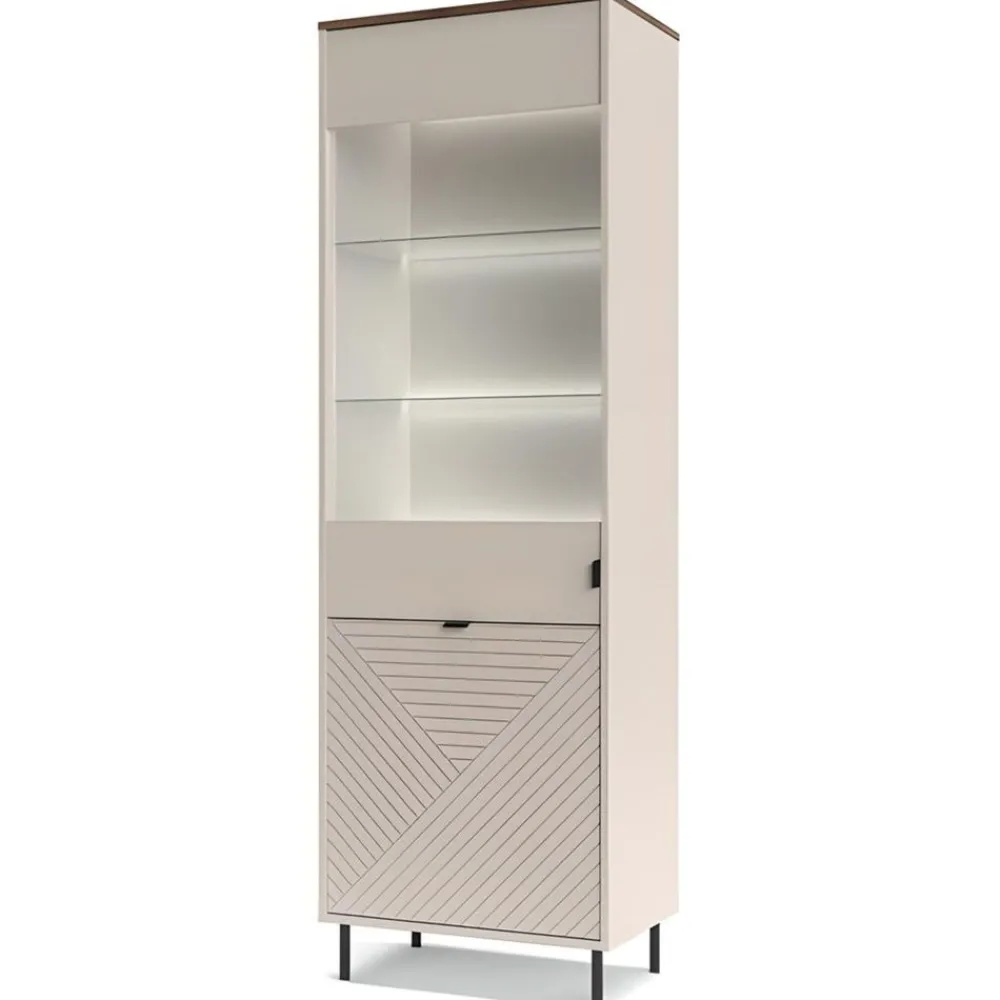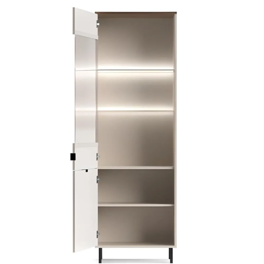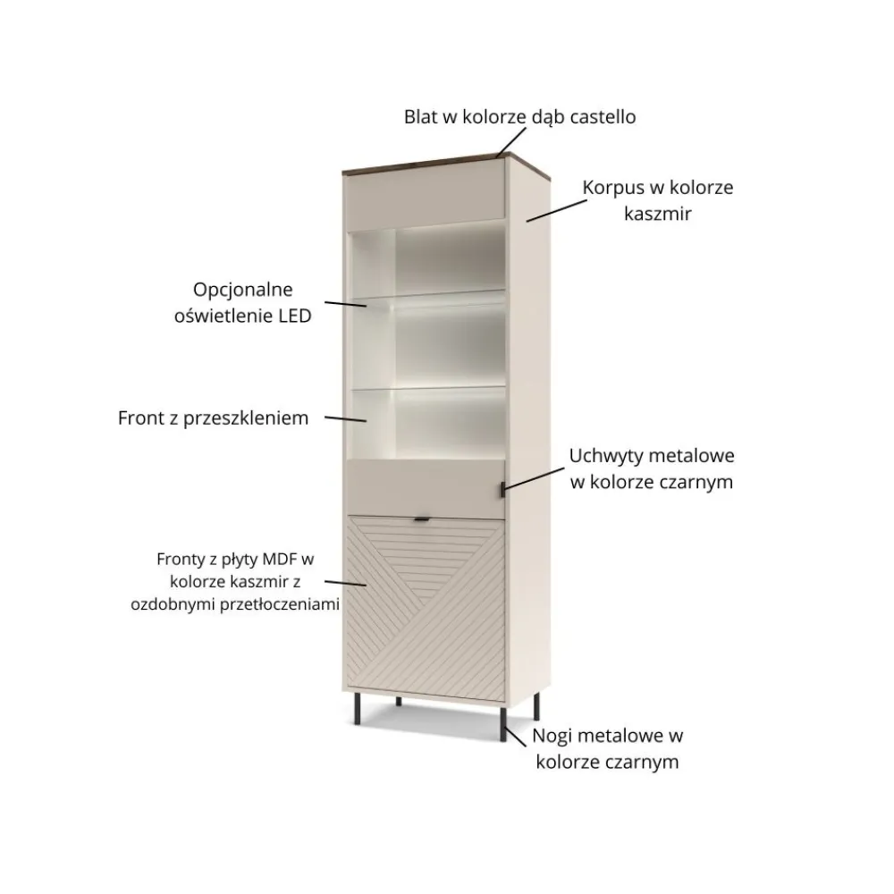 Wysoka witryna EVO 1D1W EO-09 to połączenie nowoczesnego designu z eleganckim wykończeniem, które doda Twojemu salonowi wyjątkowego charakteru. Szklane fronty i półki witryny tworzą efekt lekkości, jednocześnie eksponując przedmioty, które chcesz wyeksponować, takie jak porcelana, szkło czy dekoracje. Kolor korpusu w odcieniu kaszmiru harmonizuje z wnętrzem witryny, nadając jej ciepły i przytulny wygląd. Witryna przyciąga wzrok i stanowi doskonałe tło dla Twojej kolekcji, podkreślając jej wyjątkowość. To mebel, który doskonale wpasuje się w różnorodne aranżacje, od nowoczesnych po klasyczne, nadając wnętrzu elegancji i wyrafinowania. Witryna EVO 1D1W EO-09 nie tylko podnosi estetykę salonu, ale również tworzy przestrzeń do efektownego wyeksponowania Twoich ulubionych przedmiotów.