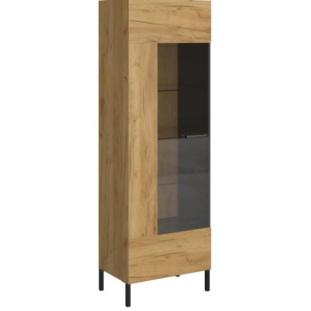 Witryna posiada 3 przeszklone półki na których wyeksponujesz ulubioną dekoracje czy zastawę stołową. Za drzwiami witryny kryją się kolejne półki do przechowywania. Wykonana z wytrzymałej płyty meblowej laminowanej. Białe ciepłe oświetlenie witryny dostępne jako opcja dodatkowa.