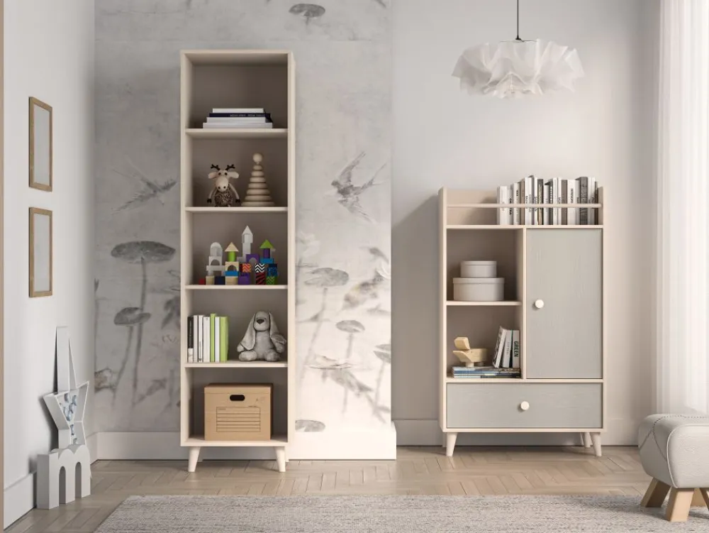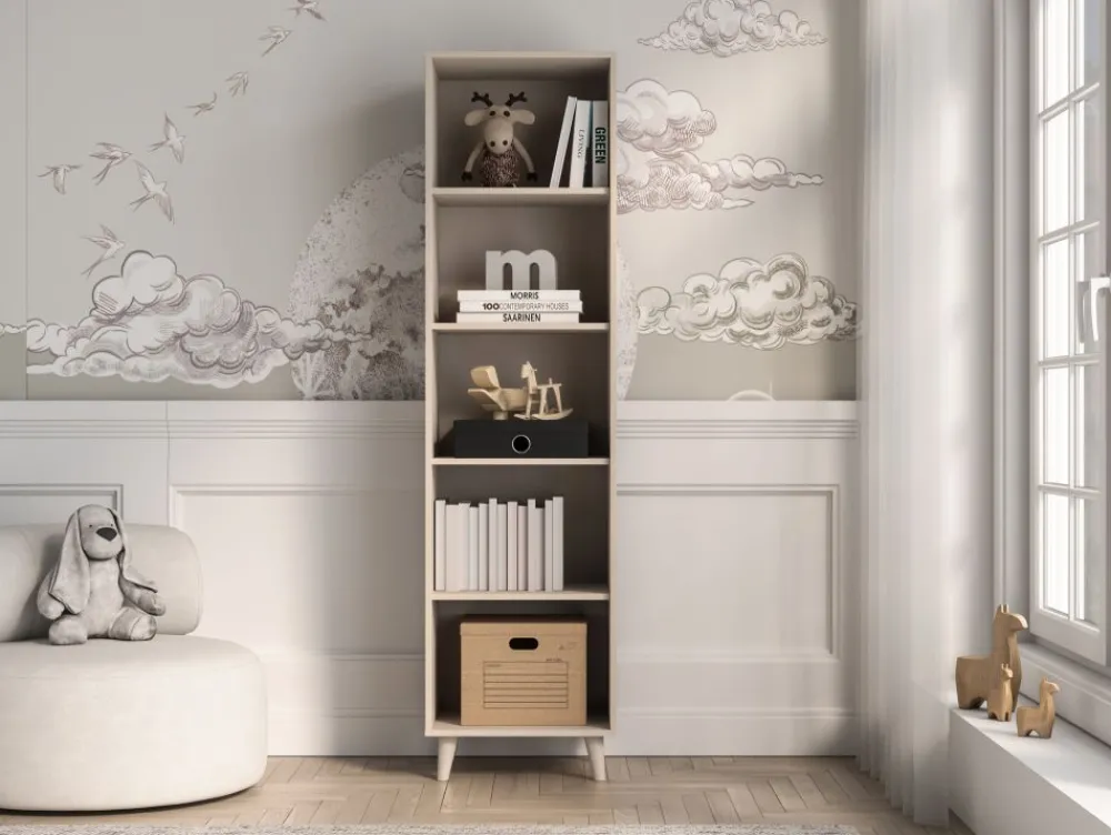 Regał Mevel 03 to mebel, który zapewni odpowiednią ilość miejsca do przechowywania oraz ekspozycji ulubionych przedmiotów. Bryłę tworzy pięć pojemnych wnęk. Otwarte półki to idealne miejsce na książki, zabawki czy kolekcję figurek. • Współczesny design. • Wysoka funkcjonalność. • Nóżki o odpowiedniej wysokości.