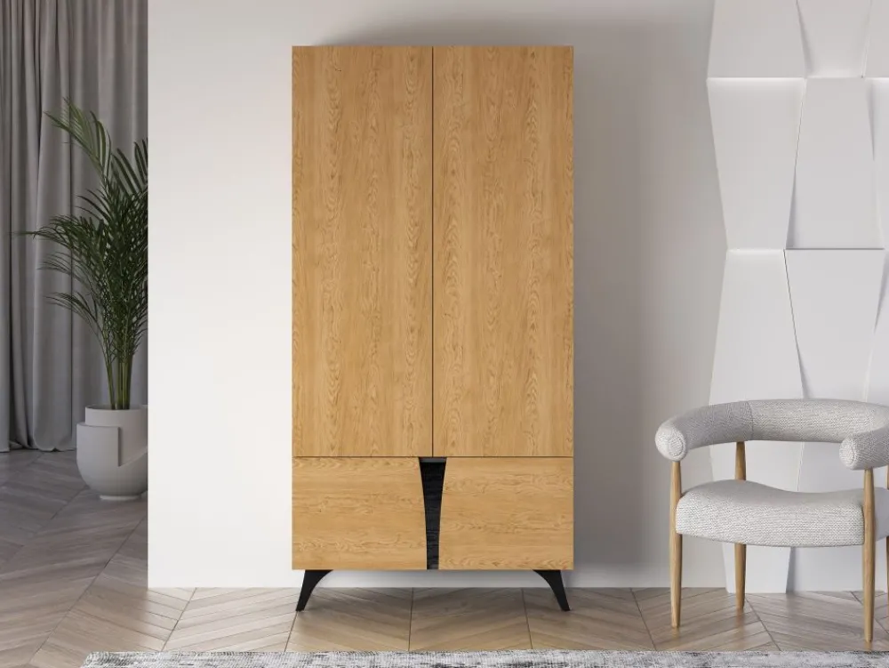 Szafa ML Meble Toscania wyróżnia się unikalnym połączeniem dekoru Baltic Dune o naturalnym, dębowym usłojeniu z kontrastującym odcieniem Jesionu Portland. Fronty bez uchwytów, wzbogacone o funkcję push to open, podkreślają nowoczesny charakter mebla. Dodatkowo, subtelnie zaokrąglone krawędzie oraz czarna, szklana wstawka w połysku nadają szafie elegancji i wyjątkowego stylu. To propozycja, która doskonale wpisuje się w aktualne trendy wnętrzarskie, łącząc funkcjonalność z estetyką.