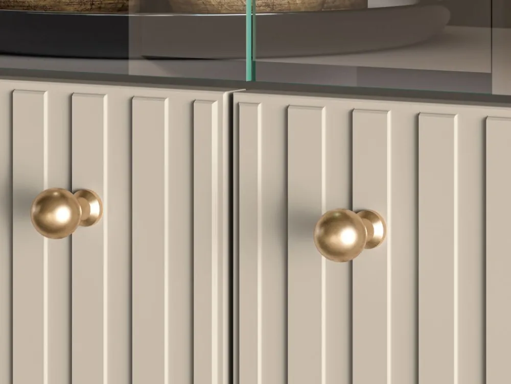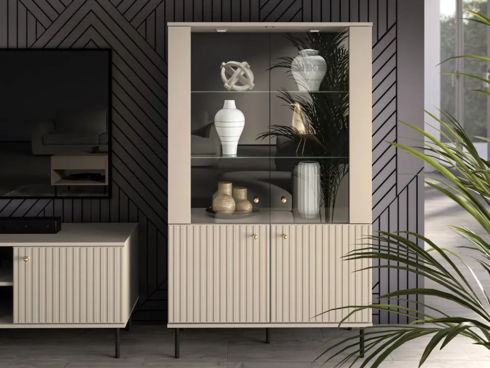 Witryna Sophie 03 zachwyca dopracowanymi detalami. Kaszmirowy dekor, delikatne frezowania, uchwyty w kolorze szczotkowanego złota i subtelne, czarne nóżki to elementy, które budują jej ponadczasowy charakter. Ten mebel idealnie odnajdzie się w nowoczesnych wnętrzach z nutą wyrafinowania.