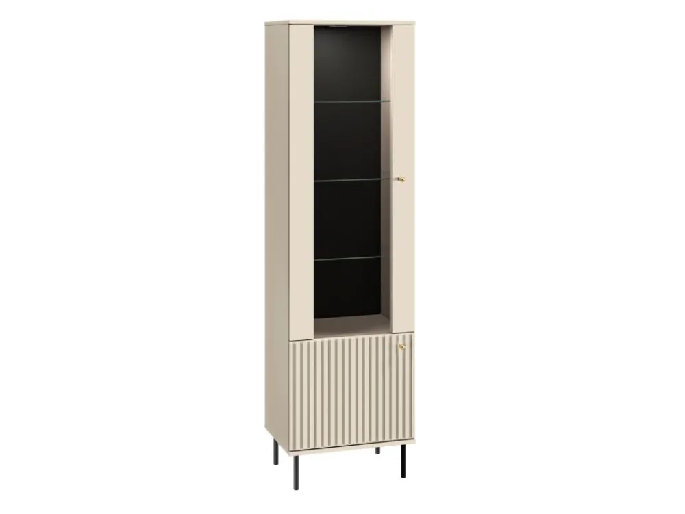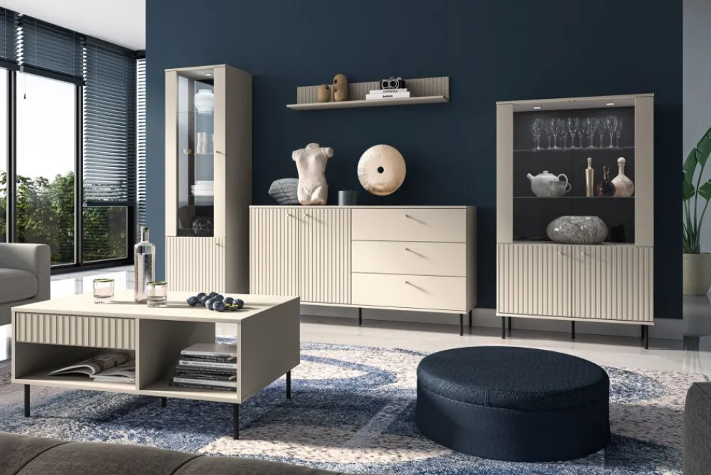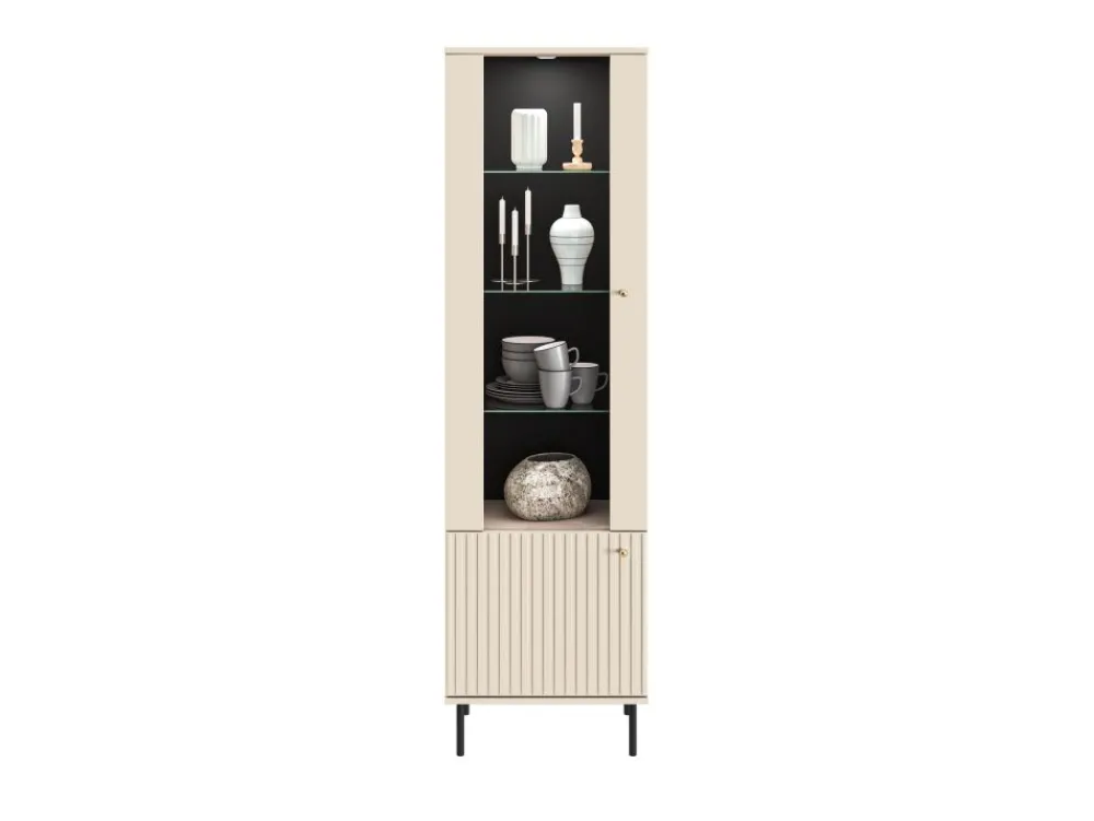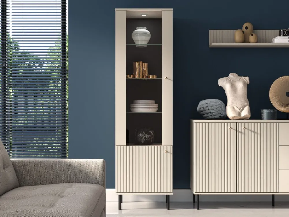 Kolekcja Sophie to połączenie współczesnej elegancji z funkcjonalnością. Dekor w kolorze kaszmiru, stylowe frezowania, smukłe czarne nóżki oraz gałki w odcieniu szczotkowanego złota tworzą harmonijną i przyciągającą wzrok całość. Witryna Sophie 02 doskonale odnajdzie się zarówno w klasycznych, jak i nowoczesnych wnętrzach.