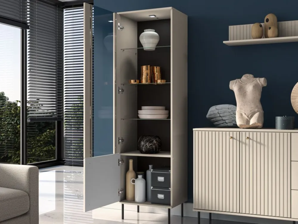 Witryna Sophie 02 to doskonały wybór dla osób, które pragną w stylowy sposób wyeksponować swoje ulubione przedmioty. Przeszklony front z trzema szklanymi półkami tworzy cztery przestronne wnęki – idealne na porcelanę, pamiątki z podróży czy książki. Zintegrowane górne oświetlenie LED z regulacją natężenia pozwala subtelnie podkreślić zawartość witryny i stworzyć przytulną atmosferę w salonie lub jadalni.