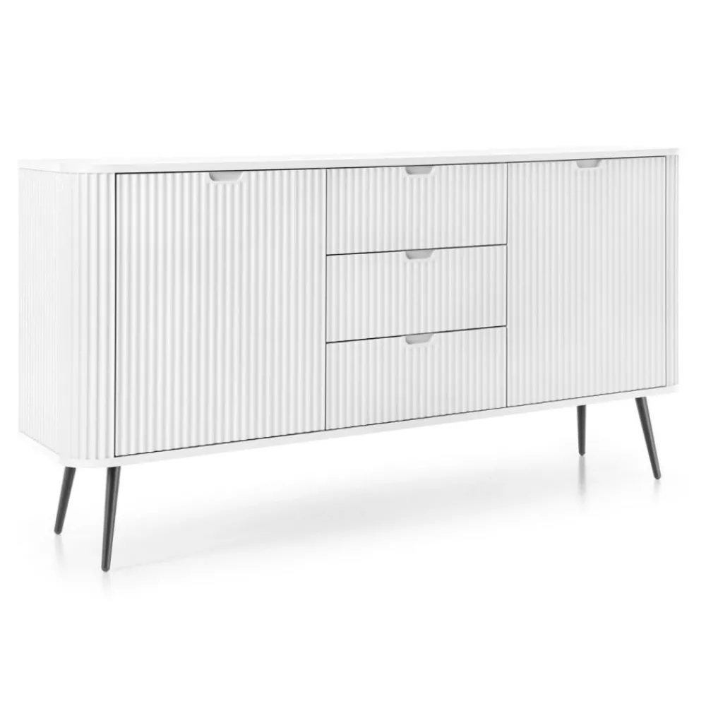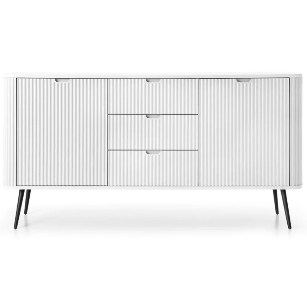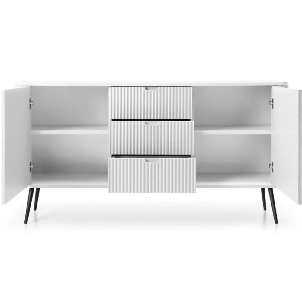 Metalowe nóżki w czarnym kolorze nie tylko stabilnie podtrzymują całą konstrukcję, ale także wnoszą element luksusu i elegancji. Drzwi komody wyposażone są w żłobione uchwyty, które ułatwiają otwieranie i dodają całości charakterystycznego, eleganckiego wyglądu. Wnętrze komody oferuje dwie praktyczne wnęki z półkami oraz trzy szuflady idealne do przechowywania niezbędnych przedmiotów, akcesoriów i dokumentów. Designerski wygląd komody Zova sprawia, że jest ona wyjątkowym dodatkiem do każdego wnętrza, wzbogacając je swoim niepowtarzalnym stylem i elegancją.