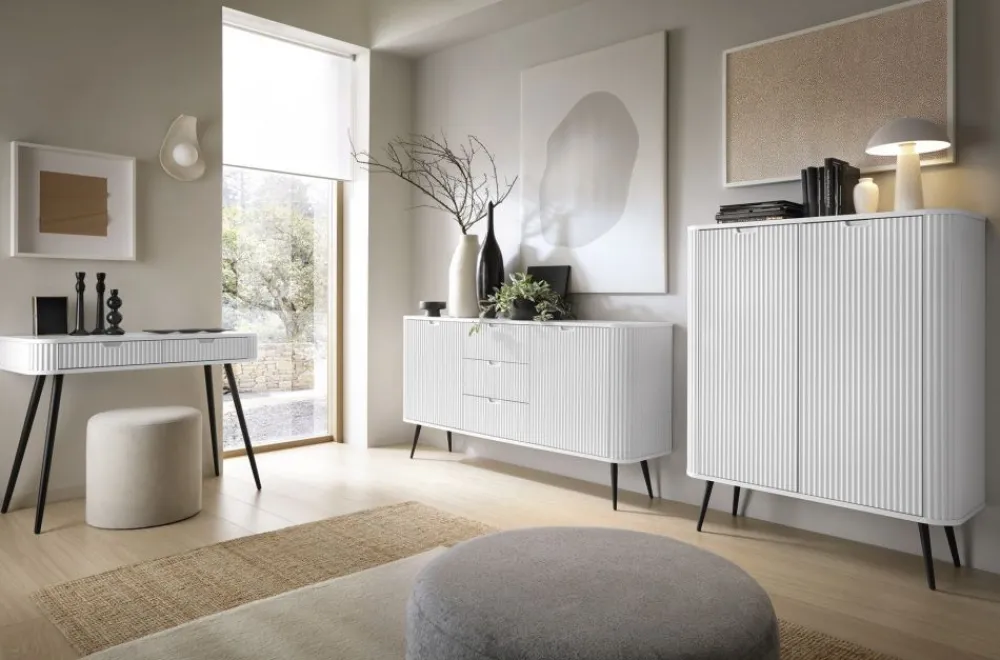 Szeroka komoda Zova to elegancki mebel, który przyciąga uwagę swoim nowoczesnym designem. Jej minimalistyczna forma łączy się z wyrafinowanymi detalami, tworząc harmonijną i stylową całość. Delikatnie zaokrąglone krawędzie dodają komodzie subtelności, podczas gdy fronty zdobione ryflowanym wzorem wprowadzają unikalny akcent i głębię wizualną. Komoda wykonana jest z wysokiej jakości płyty laminowanej oraz płyty MDF, co zapewnia jej trwałość i odporność na codzienne użytkowanie, zachowując estetyczny wygląd przez długie lata.