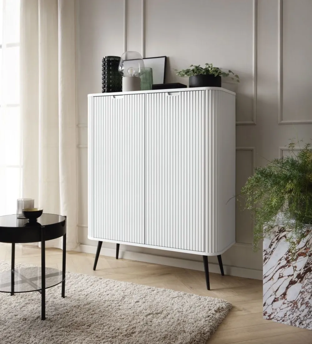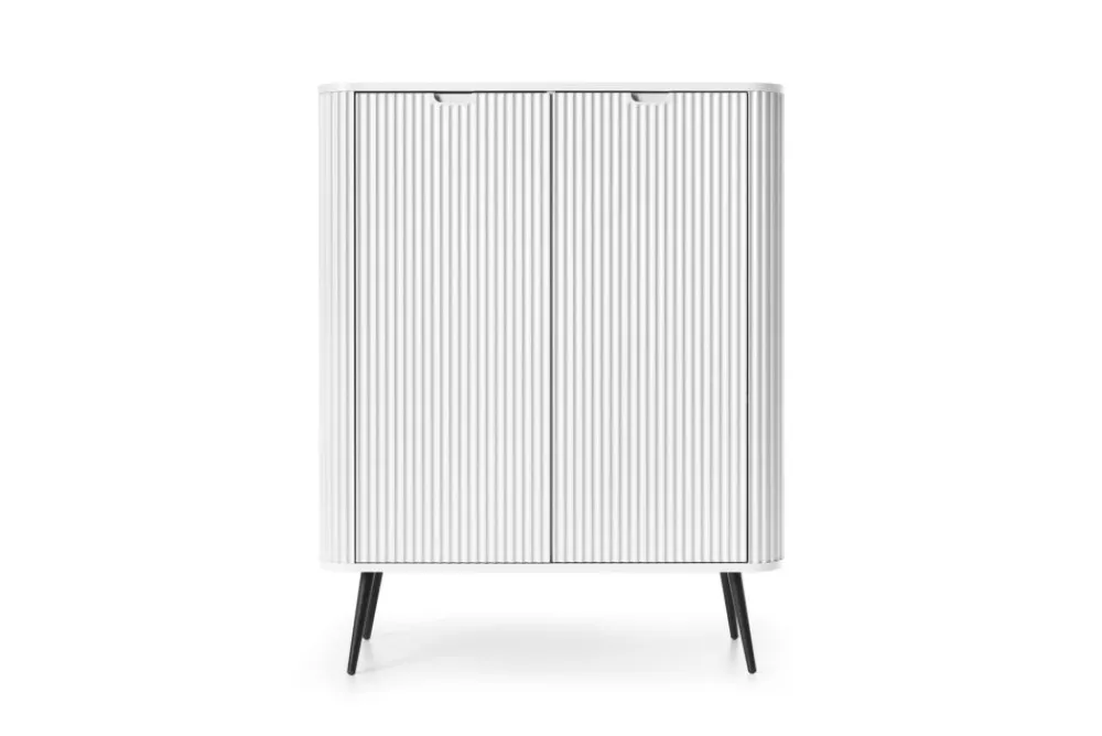 Wysoka komoda Zova to elegancki mebel, który przyciąga uwagę swoim nowoczesnym designem. Jej minimalistyczna forma łączy się z wyrafinowanymi detalami, tworząc harmonijną i stylową całość. Delikatnie zaokrąglone krawędzie dodają komodzie subtelności, podczas gdy fronty zdobione ryflowanym wzorem wprowadzają unikalny akcent i głębię wizualną. Komoda wykonana jest z wysokiej jakości płyty laminowanej oraz płyty MDF, co zapewnia jej trwałość i odporność na codzienne użytkowanie, zachowując estetyczny wygląd przez długie lata.
