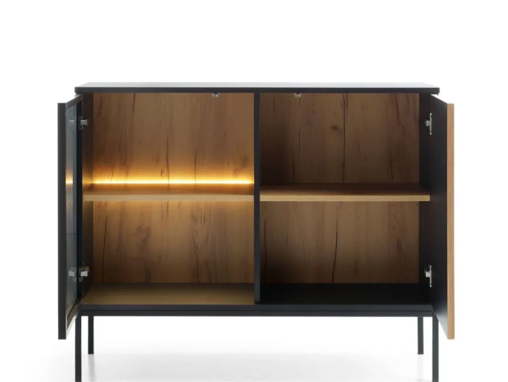 Komoda dostępna jest w kolorze dąb wotan, który harmonizuje z wieloma stylami wnętrzarskimi. Czarne elementy dodają kontrastu i wyrazistości, tworząc efektowną kompozycję. Dodatkowo, obrzeże ABS zapewnia trwałość i odporność na uszkodzenia.