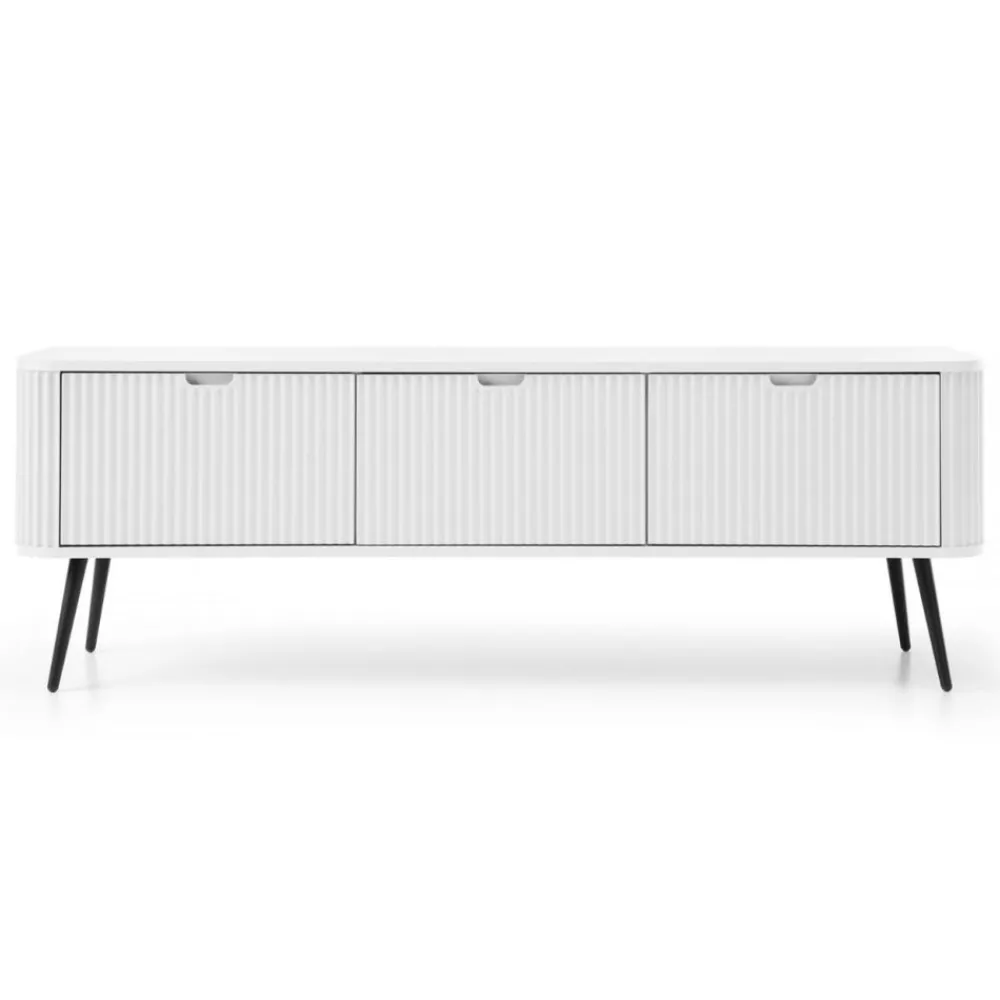 Szeroka szafka RTV Zova to wyjątkowy mebel, który łączy nowoczesny design z funkcjonalnością. Jej prosta, a zarazem elegancka forma doskonale komponuje się z nowoczesnymi wnętrzami, nadając im wyrafinowanego charakteru. Subtelnie zaokrąglone krawędzie nadają szafce delikatności, podczas gdy fronty z ryflowanym wzorem dodają jej niepowtarzalnego uroku i głębi. Szafka wykonana jest z wysokiej jakości płyty laminowanej oraz płyty MDF, co gwarantuje jej solidność i odporność na codzienne użytkowanie, a jednocześnie sprawia, że mebel zachowuje swój atrakcyjny wygląd na lata.
