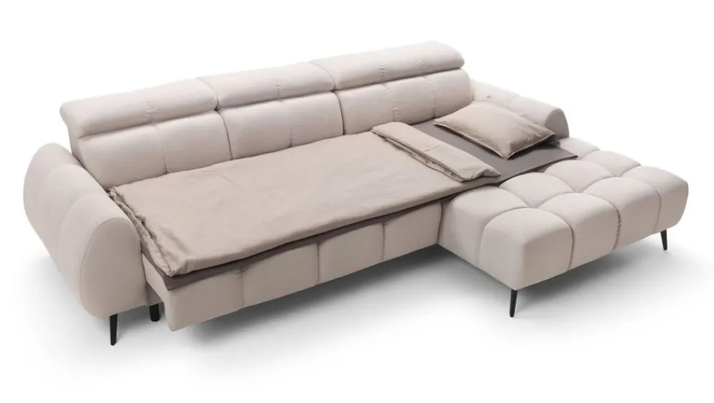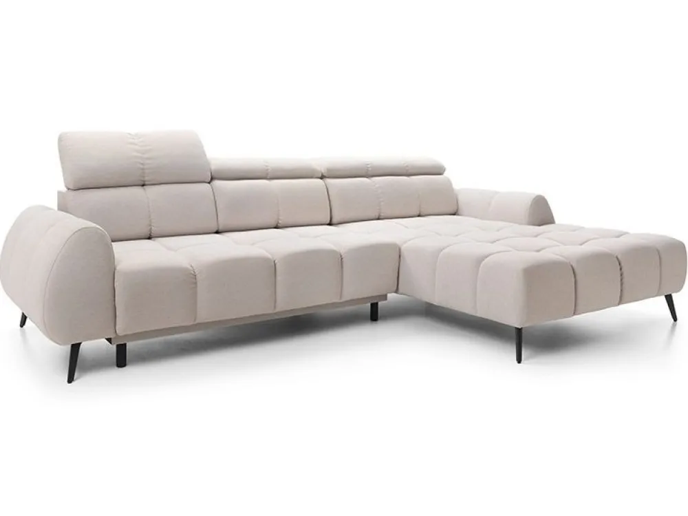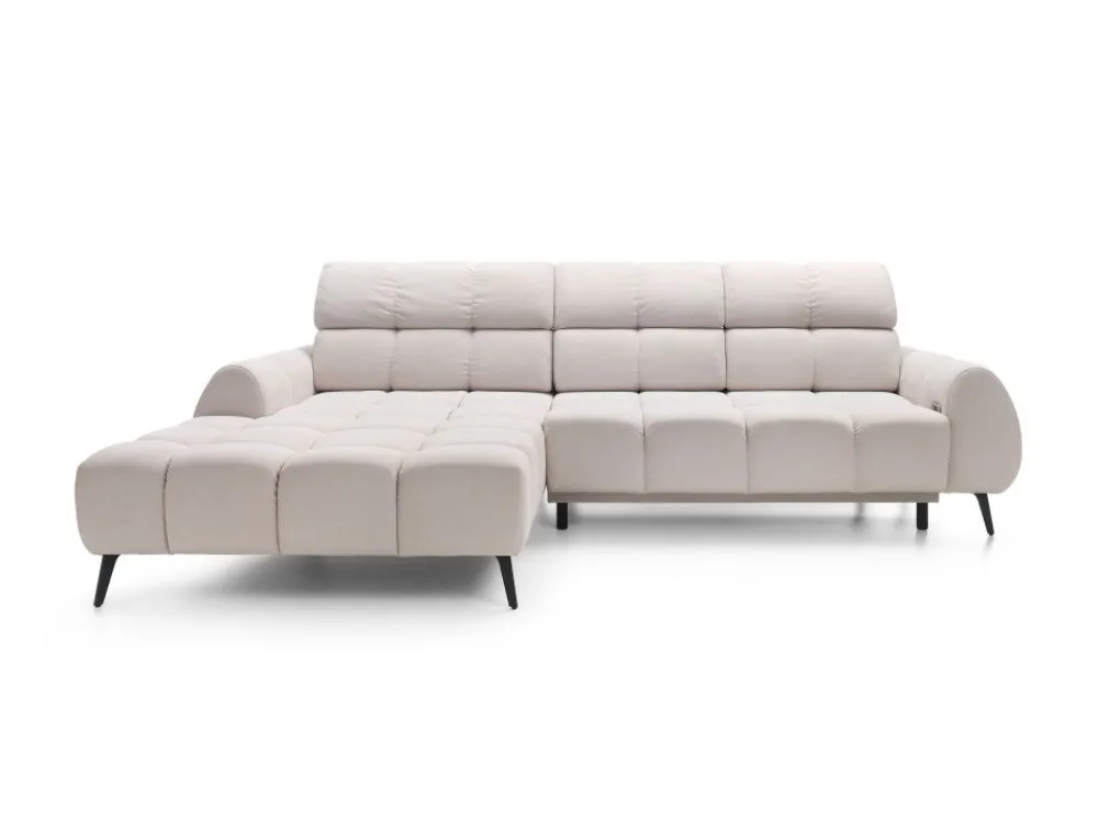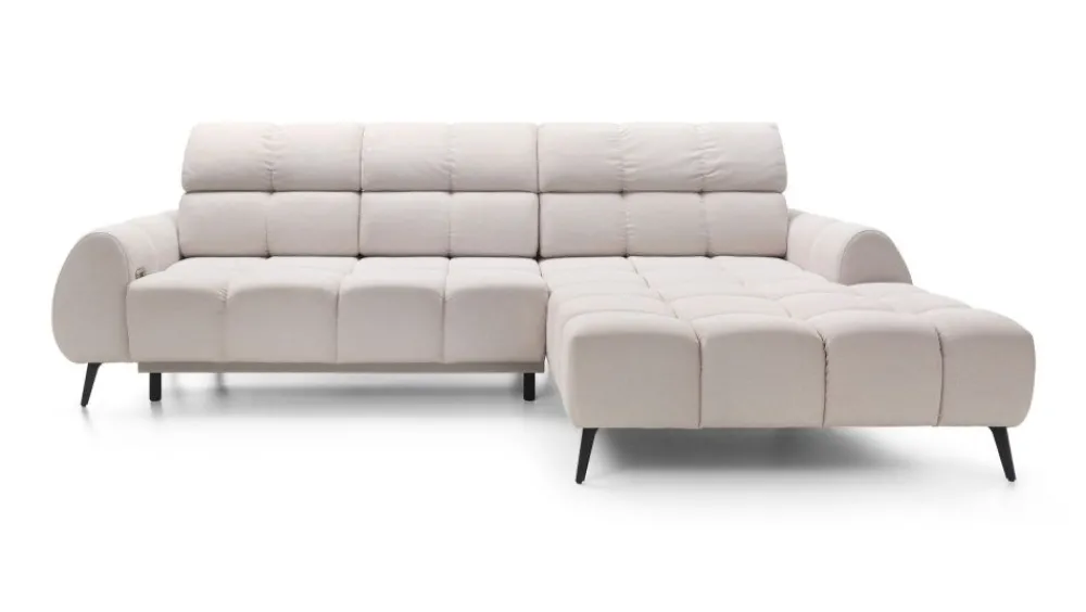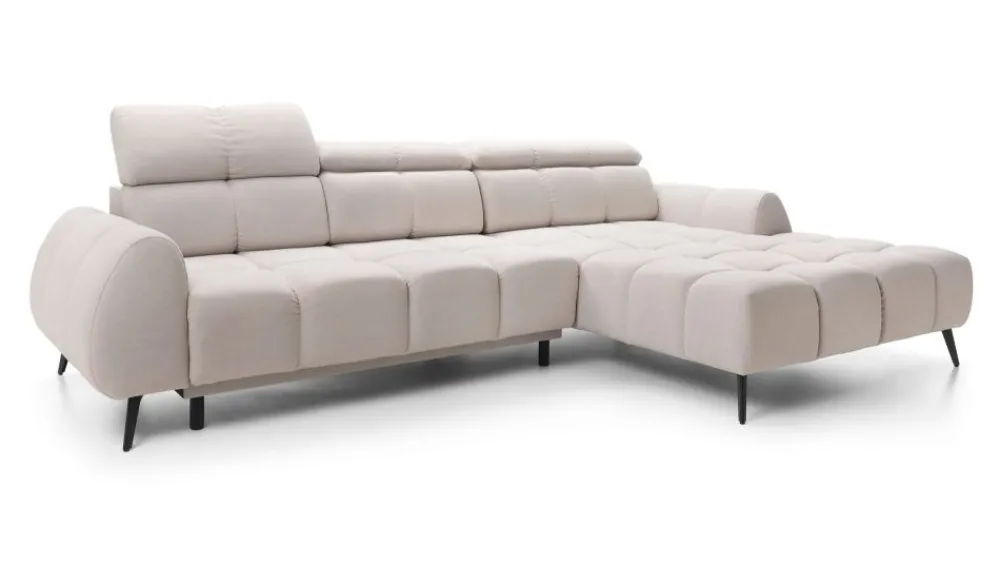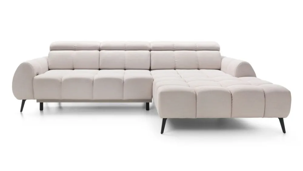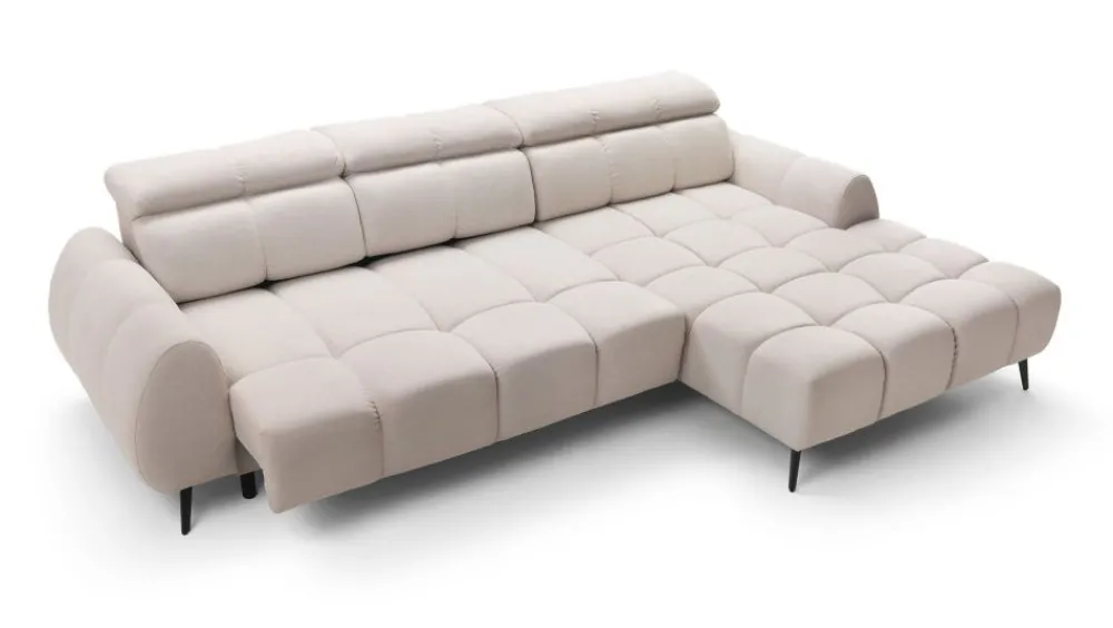 Narożnik w wypełnieniu posiada sprężyny faliste i piankę wysokoelastyczną. Możliwość elektrycznego wysuwu siedziska do 25 cm, daje możliwości uzyskania dodatkowej przestrzeni do wypoczynku. Dodatkowym atutem są regulowane zagłówki.
