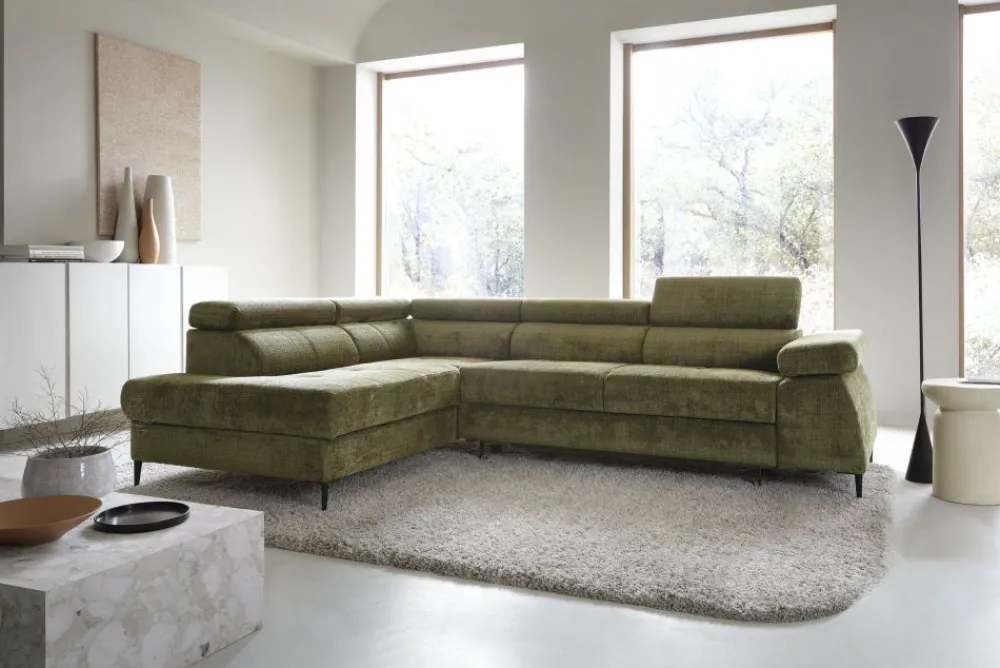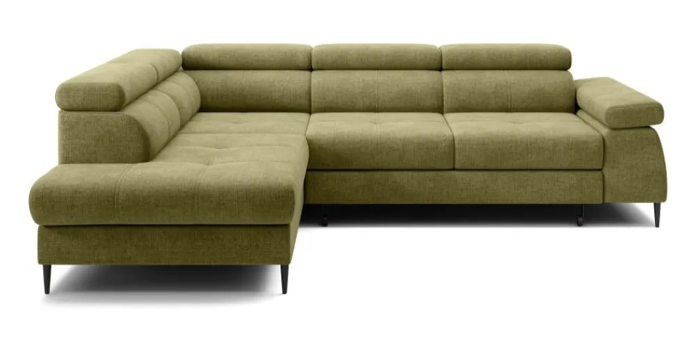 Narożnik Cordoba został wyposażony w regulowane zagłówki, które można dostosować do indywidualnych potrzeb. Dzięki temu zapewnia maksymalny komfort podczas relaksu, oglądania telewizji czy czytania. Zintegrowany pojemnik na pościel zapewnia dodatkową przestrzeń do przechowywania, pomagając utrzymać porządek w Twoim salonie. Koniec z problemem braku miejsca na koce i poduszki!