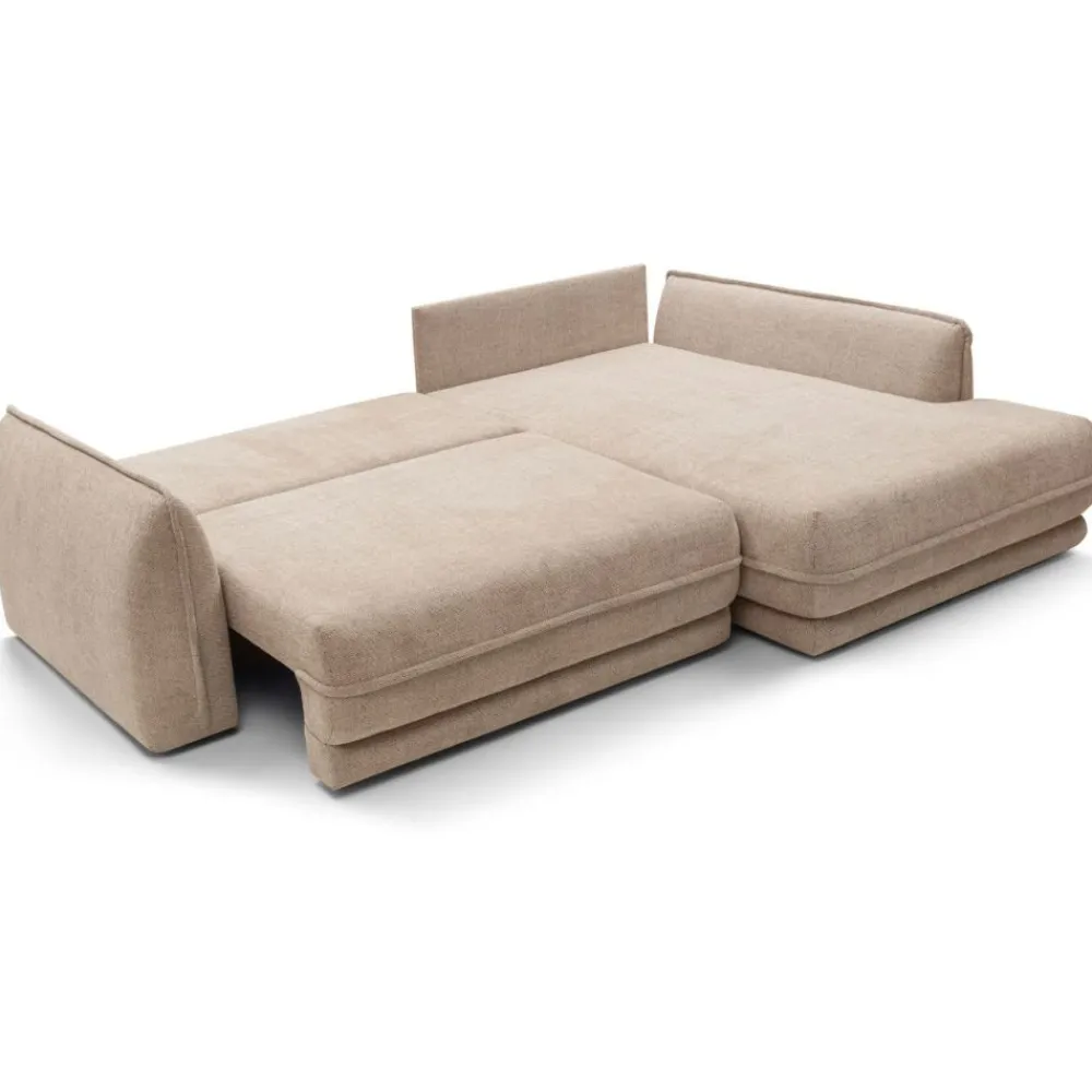 Narożnik z funkcją spania Mojave rozkłada się dzięki mechanizmowi DL, tworząc komfortowe łóżko o powierzchni 160×228 cm. Dodatkowy pojemnik na pościel pozwala na wygodne przechowywanie kołdry i poduszek, dzięki czemu salon zachowuje porządek.