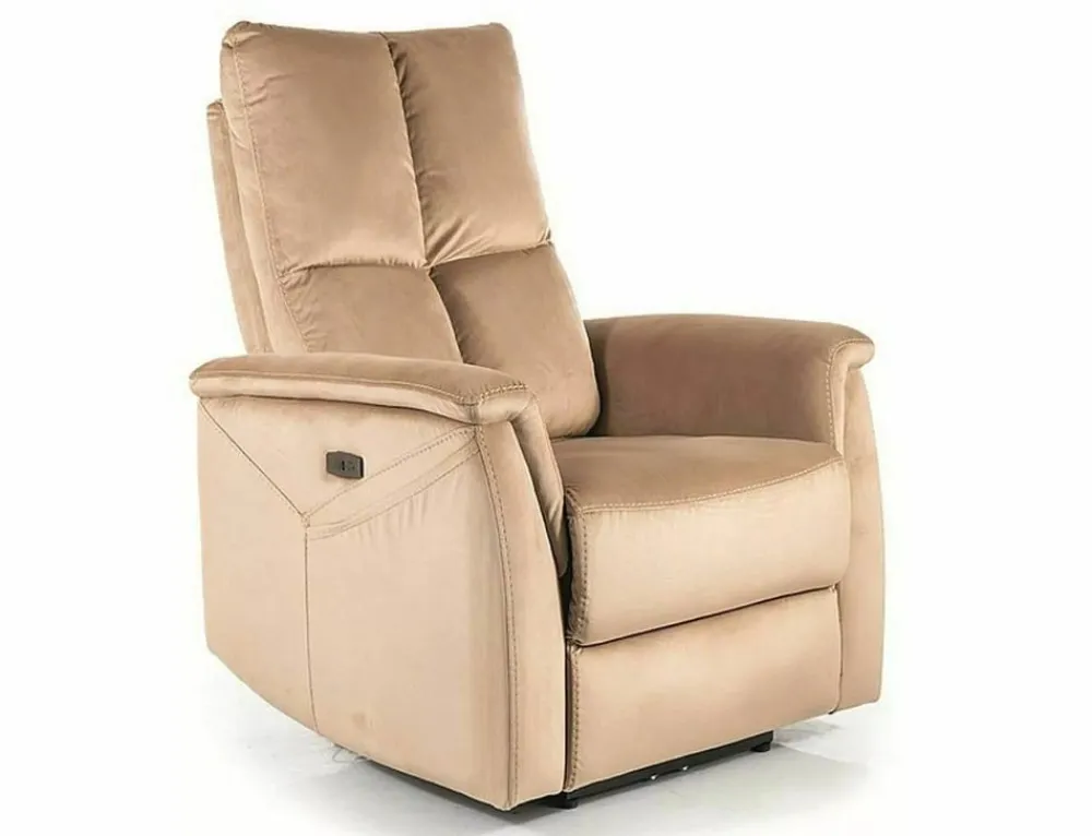 Fotel rozkładany elektrycznie z funkcją masażu, tkanina aksamit: Bluvel, kolory: beżowy 28. Sterowanie rozkładaniem za pomocą panelu na prawym boku fotela. Panel wyposażony dodatkowo w podświetlany port USB. Funkcje masażu regulowane za pomocą przewodowego pilota, w opcji: czas pracy, wybór strefy i intensywności masażu, podgrzewanie odcinka lędźwiowego. Bok fotela posiada praktyczną kieszeń.