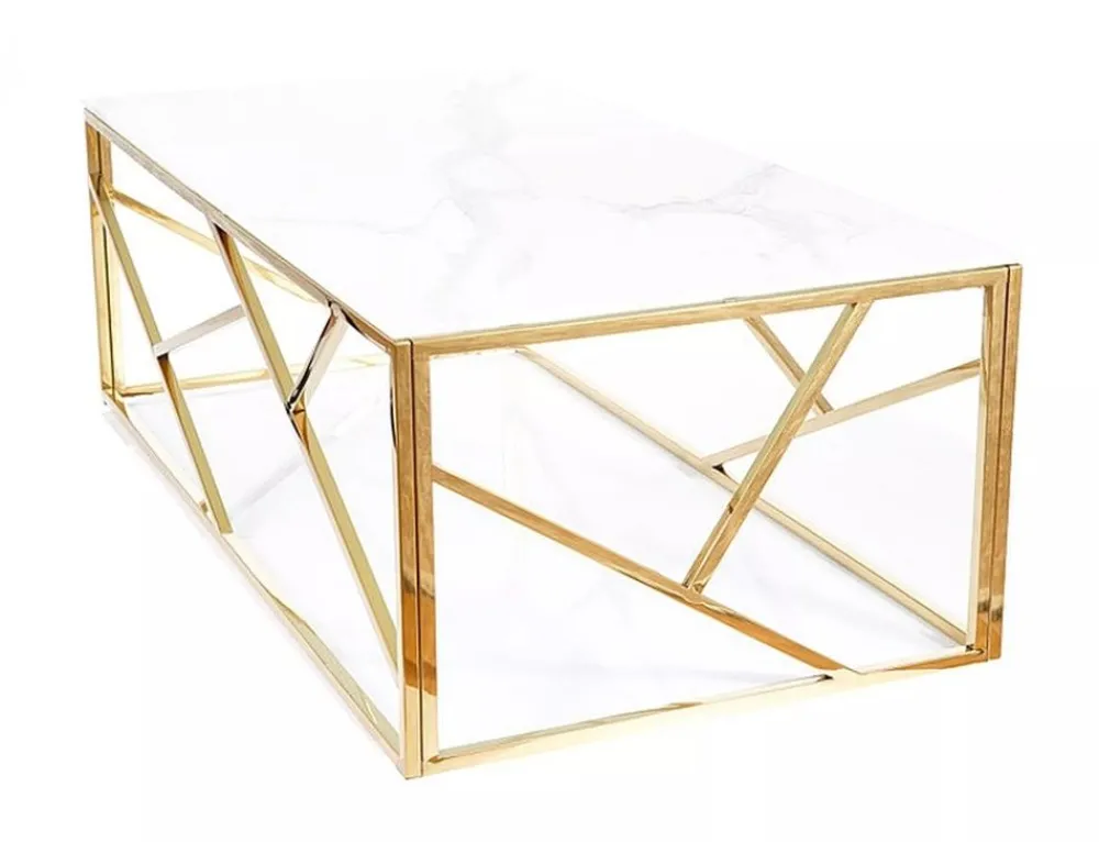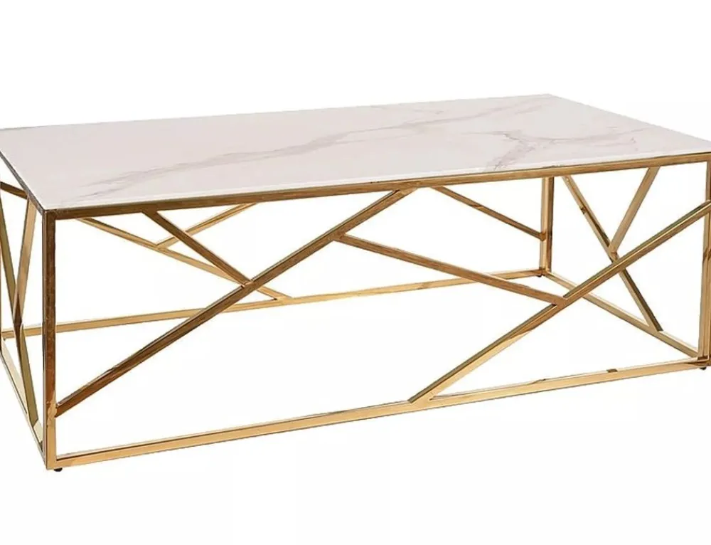 Ława, blat: szkło hartowane, stelaż: stal nierdzewna, kolor: biały, efekt marmuru / złoty.