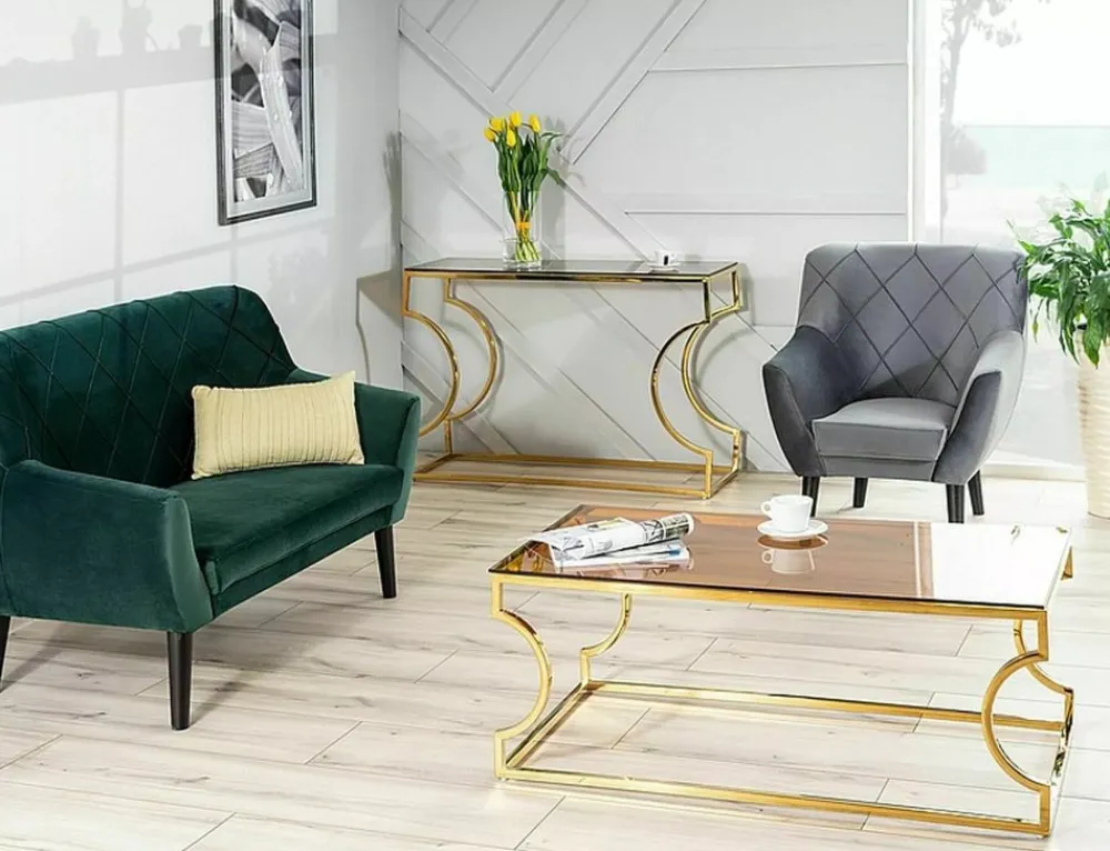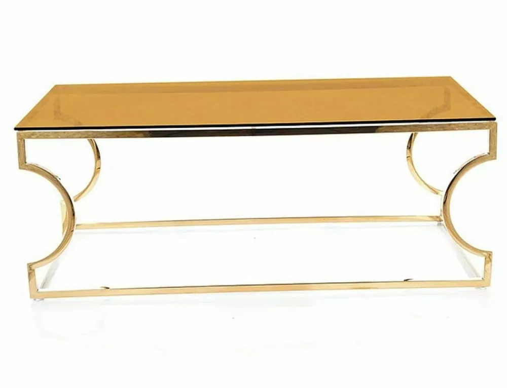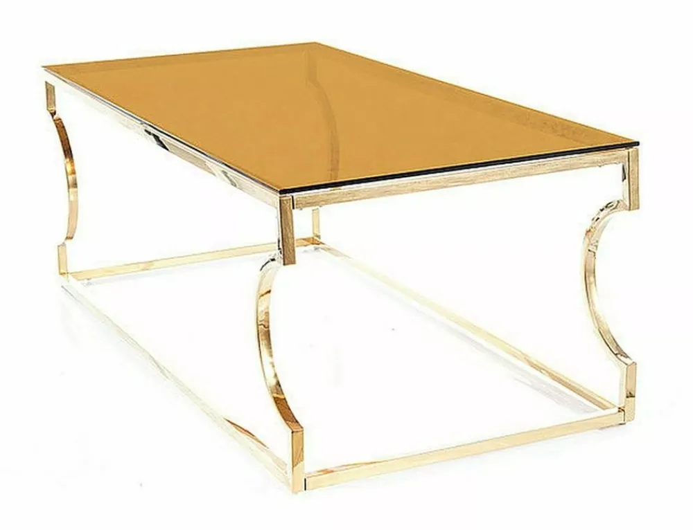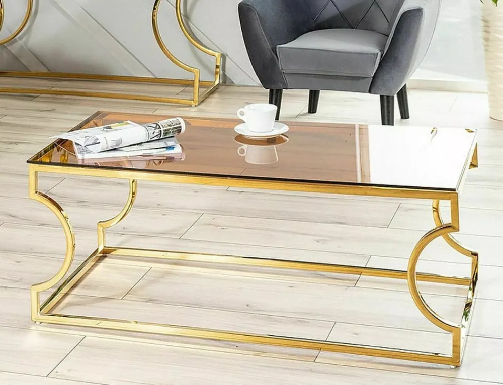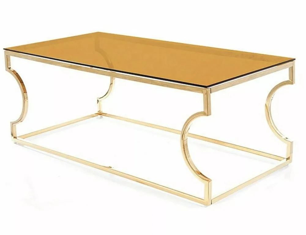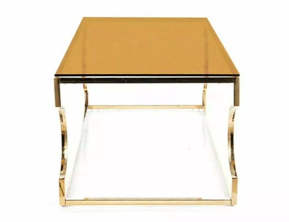 Ława, blat: szkło hartowane bursztynowe, stelaż: stal nierdzewna, kolor: złoty.
