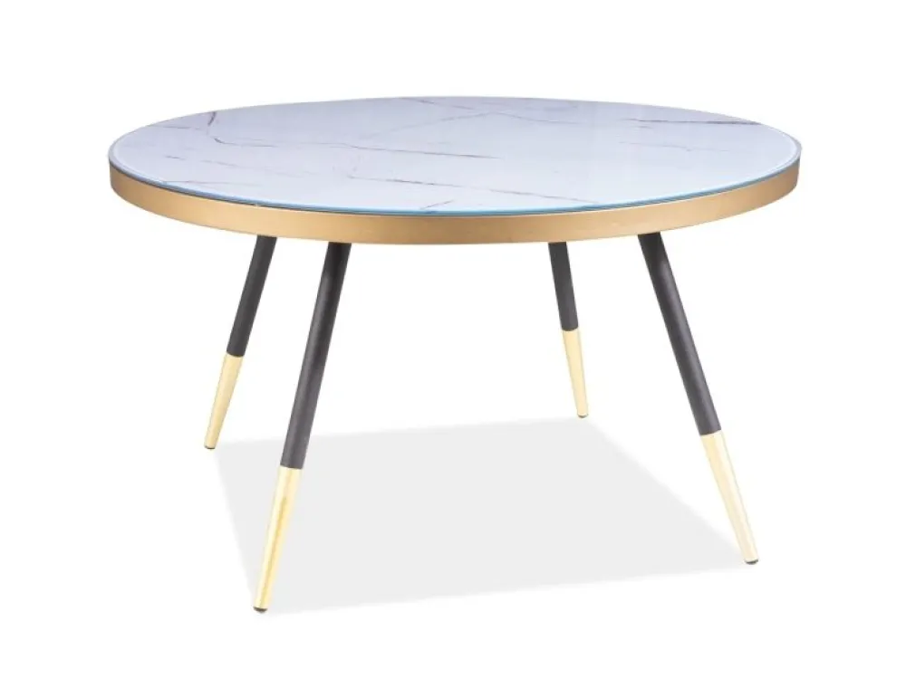 Ława, blat: szkło+okleina, stelaż: metal, kolor: biały, efekt marmuru / czarny + złoty.