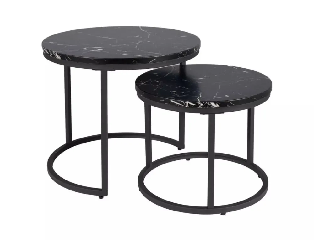 Zestaw ław, blat: MDF + okleina z efektem marmuru, stelaż: metal, kolor: czarny / czarny. Wymiary mniejszego stolika: średnica 43; wysokość: 35cm.