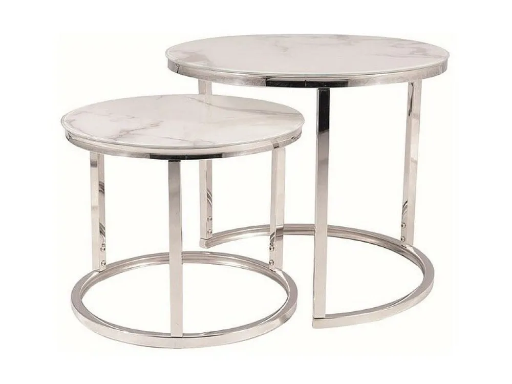 Zestaw ław, blat: szkło, stelaż: metal, kolor: biały, efekt marmuru / chrom. Wymiary mniejszego stolika fi: 43, h-35cm.