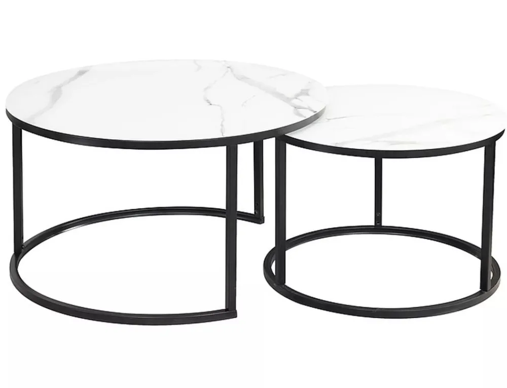 Zestaw ław, blat: szkło, stelaż: metal, kolor: biały mat, efekt marmuru / czarny mat. Wymiary mniejszego stolika fi: 60, h-42cm.