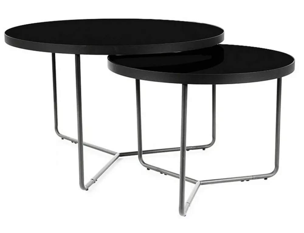 Zestaw ław, blat: szkło hartowane, stelaż: metal, kolor: czarny / czarny. Wymiary mniejszego stolika: