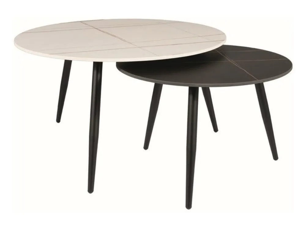 Zestaw ław, blat: ceramika, stelaż: metal, kolor: biały, czarny, efekt marmuru / czarny mat. Wymiary mniejszego stolika: średnica 60; wysokość: 40cm.