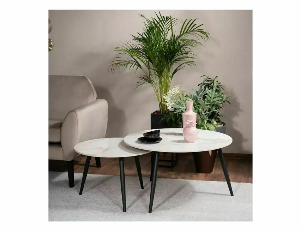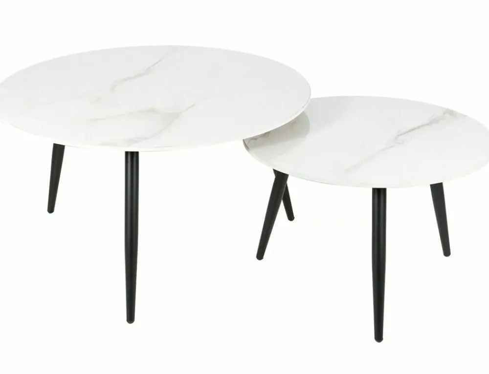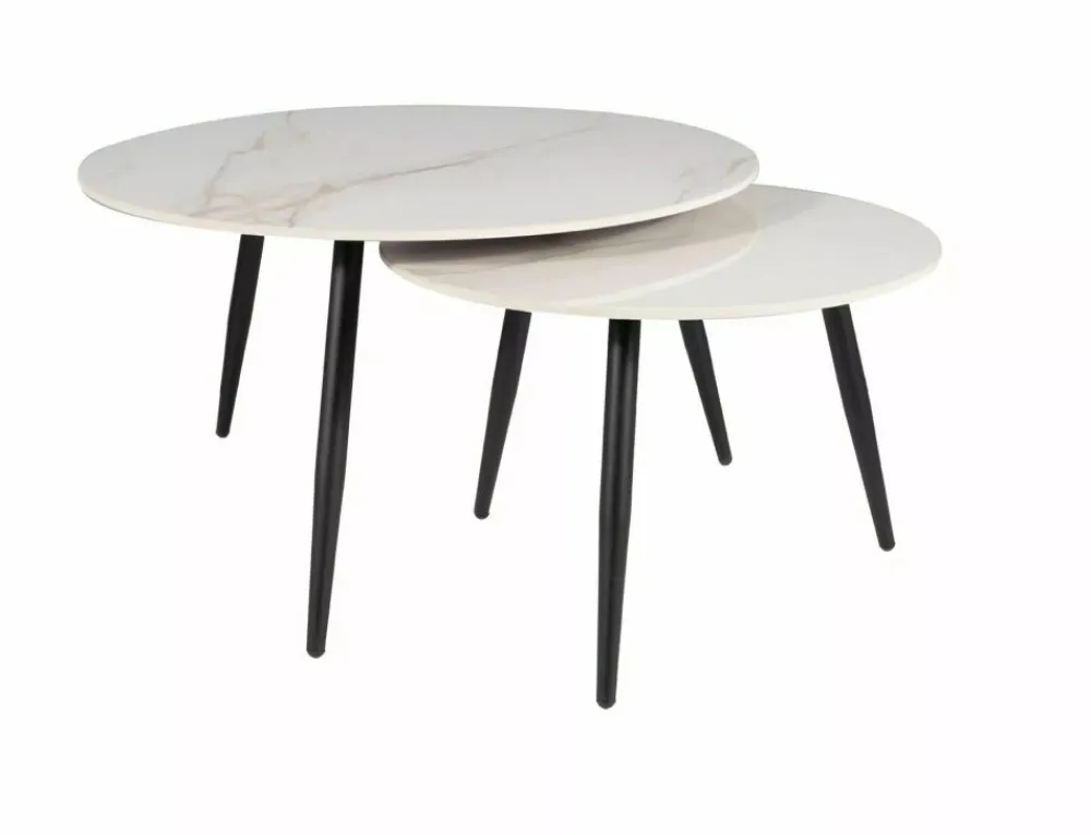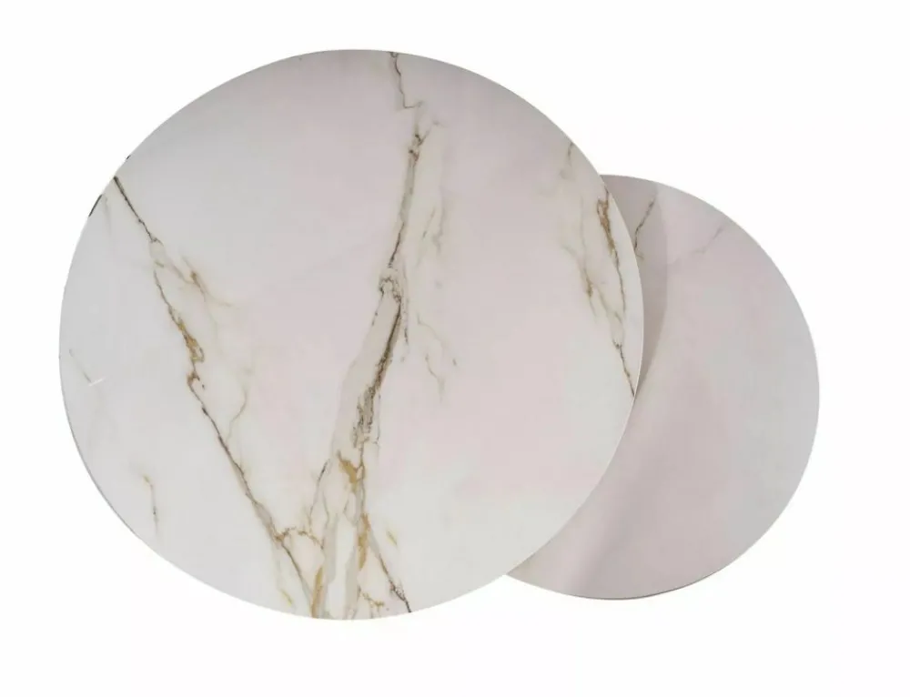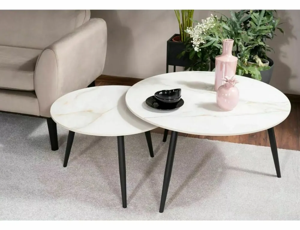 Zestaw ław, blat: ceramika, stelaż: metal, kolor: biały, efekt marmuru / czarny mat. Wymiary mniejszego stolika: średnica 60; wysokość: 40cm.