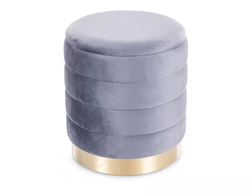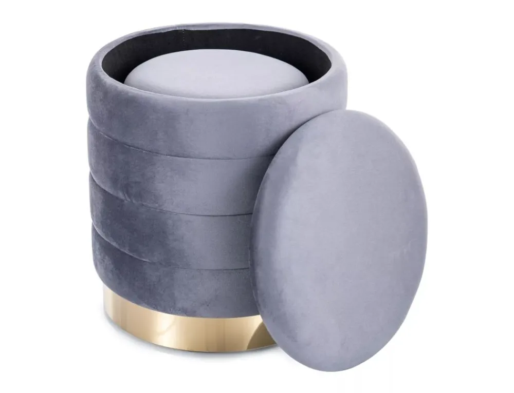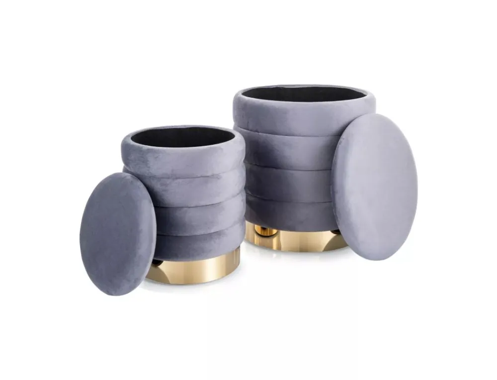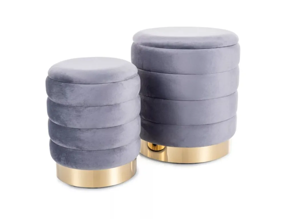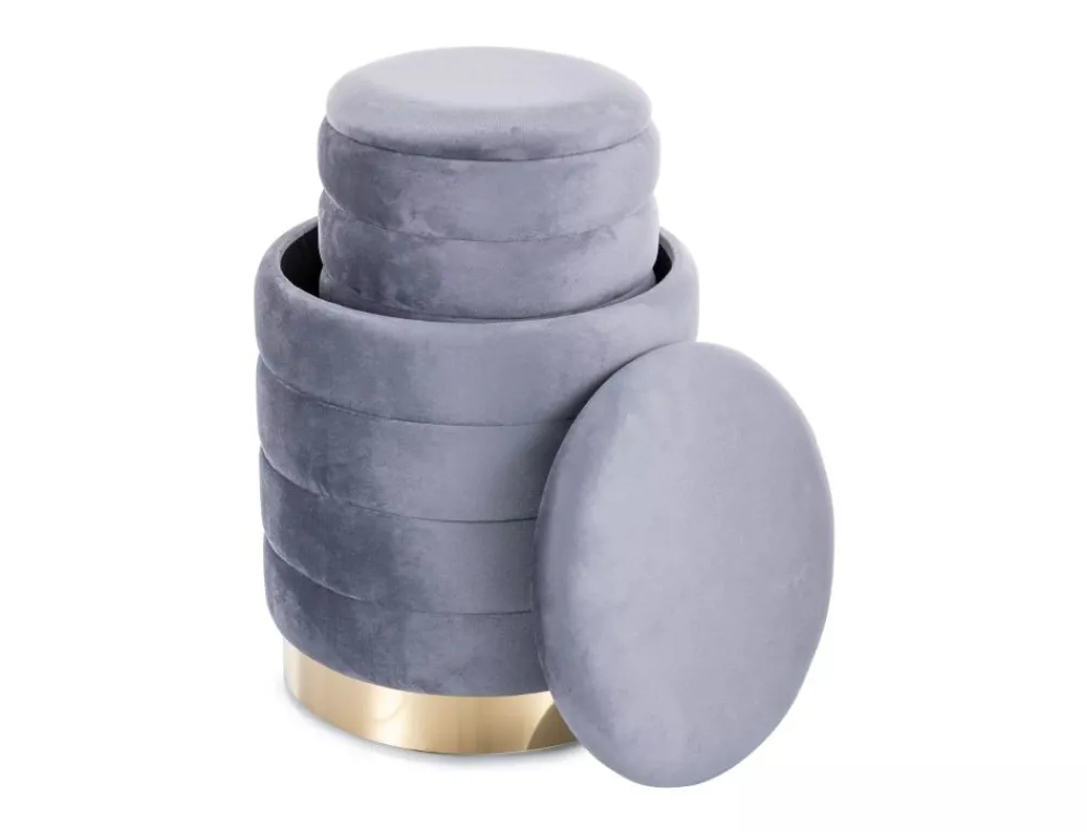 Zestaw puf z pojemnikiem, tkanina aksamit, kolor: szary, tap. 252. Mniejszy puf chowany w duży, wymiary mniejszego fi – 30, h -38 cm.