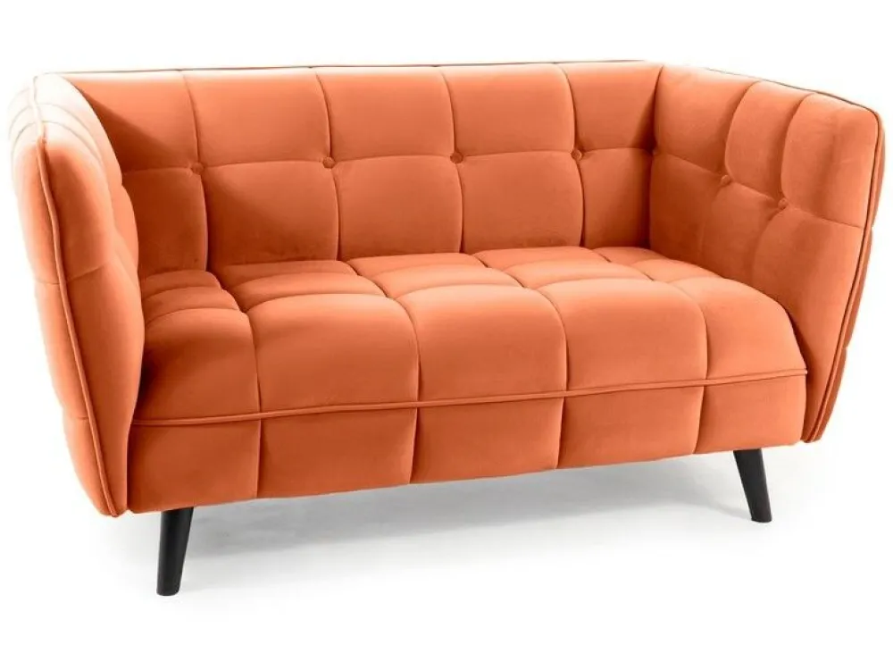 Sofa, tkanina aksamit: Bluvel 4215 – cynamonowy / drewno, kolor: wenge. Wymiary sofy: A – 78, B – 145, C – 43, D – 60, E – 85, F – 12 cm.