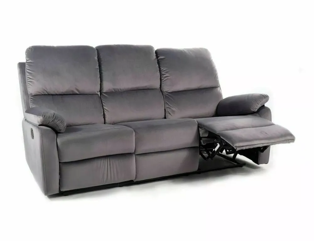 Sofa 3-osobowa z funkcą ro, tapicerka: tkanina aksamit, stelaż: metal, kolor: szary / czarny. Rozkładane dwa skrajne siedzenia, część środkowa nieruchoma. Wymiary sofy: A – 101, B – 193, C – 48, D – 54, E – 94÷164, F – 5 cm.