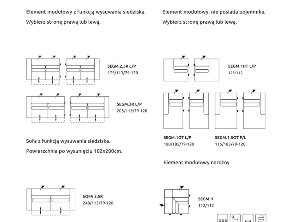 Narożnik dostępny jest w opcji prawostronnej (SEGM.2,5RL + SEGM.1.OTP) i lewostronnej (SEGM.1OTL+SEGM2,5RP)