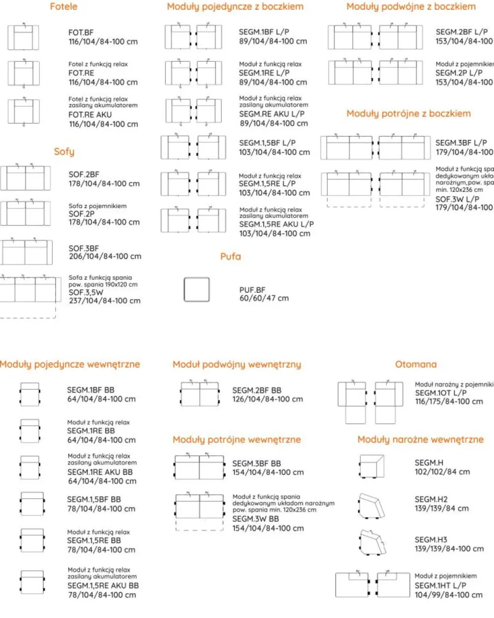 Dzięki temu, że Imperio należy do grupy mebli modułowych, możemy korzystając z dostępnych elementów – tworzyć różne konfiguracje modelu, dopasowując go do wielkości pomieszczenia i indywidualnych preferencji. Podana cena obejmuje sofę trzyosobową prezentowaną na zdjęciu głównym. Równie dobrze możemy stworzyć kanapę dwuosobową, fotel z funkcją relax lub narożnik. Poniżej prezentujemy wszystkie dostępne moduły prezentowanej kolekcji.