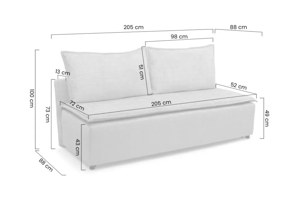 Dzięki nowoczesnemu systemowi rozkładania DL, kanapa Firioza w kilka chwil zamienia się w przestronne łóżko o wymiarach 205 x 146 cm. To idealne rozwiązanie do mniejszych mieszkań, gdzie każdy centymetr przestrzeni ma znaczenie. Wygodne siedzisko wykonane z pianki poliuretanowej T30 oraz sprężyn falistych gwarantuje relaks zarówno w ciągu dnia, jak i w nocy. Dodatkowy toper jeszcze bardziej podnosi komfort wypoczynku. Kanapa może pełnić funkcję głównego łóżka lub być wykorzystywana jako miejsce do spania dla gości. Komfort snu porównywalny jest z tradycyjnym łóżkiem sypialnianym.