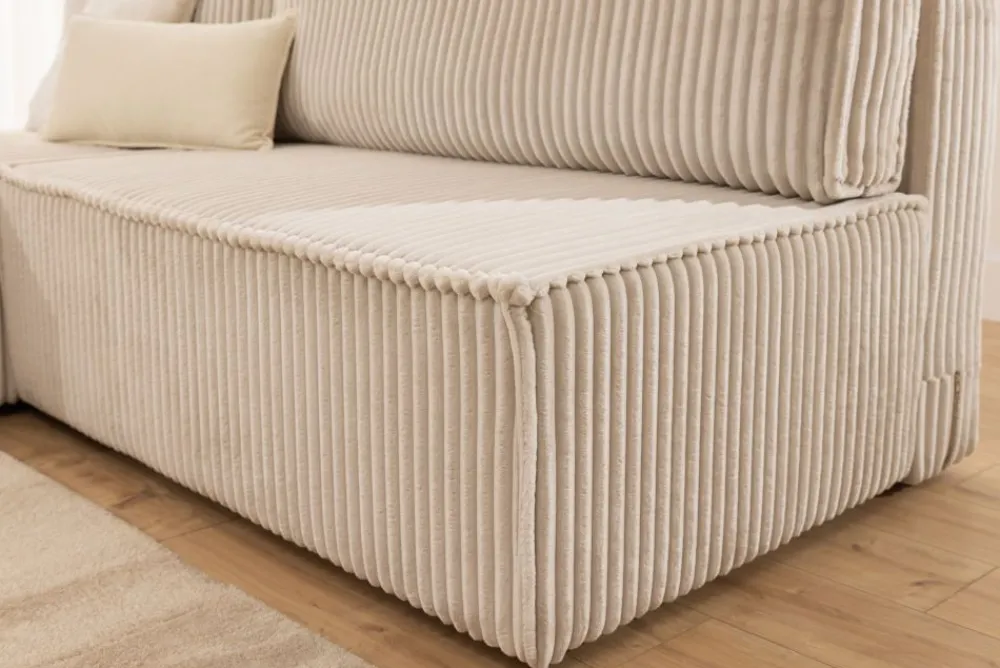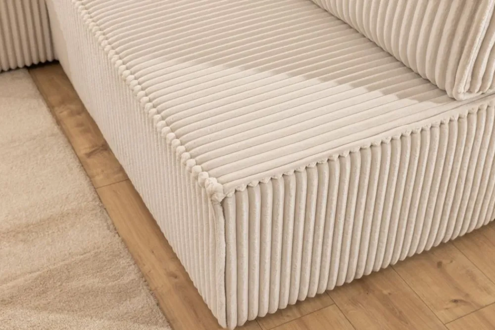 Wnętrze narożnika wykonane zostało z połączenia drewna i płyty wiórowej, co zapewnia trwałość konstrukcji. Siedzisko oparto na piance wysokoelastycznej HR i sprężynach falistych, co przekłada się na wyjątkowy komfort użytkowania i odporność na odkształcenia. Zdejmowane poduszki na zamek ułatwiają czyszczenie i codzienne użytkowanie.