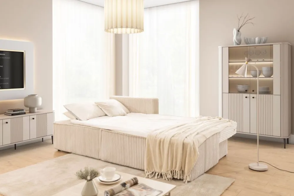 Solvero Mini został wyposażony w funkcjonalny pojemnik na pościel, dzięki któremu zyskujesz dodatkową przestrzeń do przechowywania kołder, poduszek czy koców. To idealna opcja, by utrzymać porządek w salonie bez konieczności szukania miejsca w szafach.