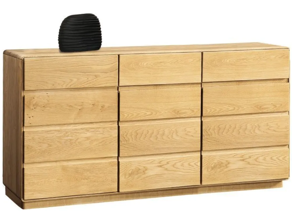 Kolejna propozycja to duża komoda z szafkami i szufladami. Komoda składa się z zestawu szafek zamykanych – są to trzy szafki w dolnej części oraz z zestawu trzech szuflad – panel górny. Jest to uniwersalne rozwiązanie które w idealny sposób łączy zamykane szafki oraz praktyczne i pojemne szuflady. W skład kolekcji wchodzą witryny, komody, szafki RTV, regały, łóżko, stoły oraz krzesła, dzięki temu możemy stworzyć wymarzony zestaw mebli zarówno do salonu, jadalni, biura jaki i sypialni. Kolekcja Atlanta dzięki mnogości brył zdecydowanie jest bardzo uniwersalną propozycją.