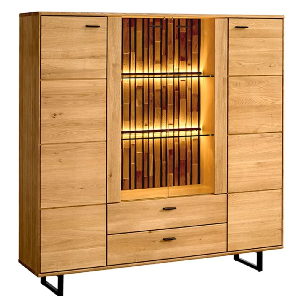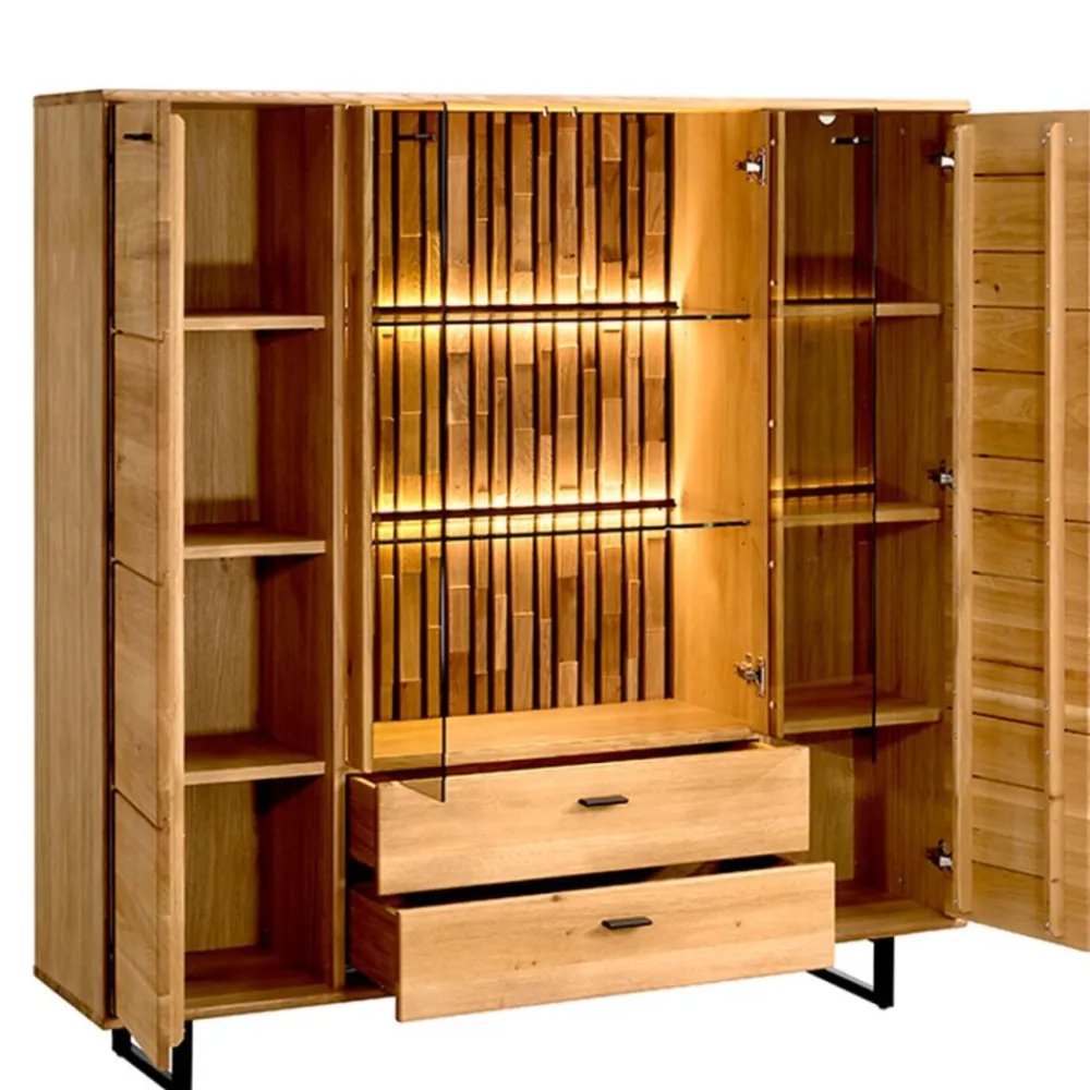 Jednym z najbardziej wyróżniających się elementów tej komody z oświetleniem jest subtelne światło LED zamocowane na szklanych półkach. Ciepła barwa światła tworzy przytulną atmosferę, podkreślając piękno drewnianych lameli i detali wewnętrznych. Oświetlenie nadaje meblowi nowoczesności, jednocześnie wprowadzając do wnętrza luksusowy charakter. Dzięki temu Twoje dekoracje i kolekcje będą wyglądały efektownie zarówno w dzień, jak i po zmroku. To doskonały sposób na dodanie nastrojowego akcentu do każdego salonu.