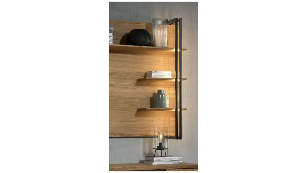 Trudno wyobrazić sobie mieszkanie bez książek, dekoracji, czy pamiątek. Pomocne w ich wyeksponowaniu będą regały, witryny, a także mniejsze i większe półki. Nie mogło ich również zabraknąć w kolekcji Vigo. Prezentowany model do duży, wiszący panel z półkami i dekoracyjnym oświetleniem w komplecie. Ten element kolekcji, będzie stanowić doskonałe uzupełnienie aranżacji wnętrza. W ofercie dostępne są również półki wiszące oraz otwarty regał stojący. W skład kolekcji wchodzą witryny, komody, szafka RTV, regały oraz stolik, dzięki temu możemy stworzyć wymarzony zestaw mebli zarówno do salonu, jak i jadalni.