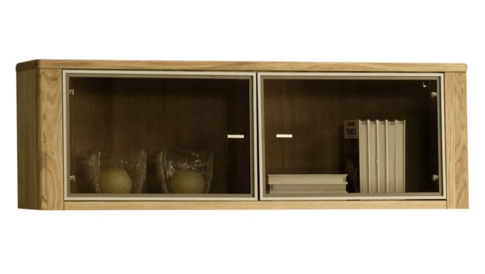 Witryna wisząca z kolekcji Orlando to doskonały przykład minimalistycznego designu. Jej wyjątkowo elegancki wygląd wzbogaca każde wnętrze, dodając mu charakteru. Wykonana z litego drewna dębowego na frontach, a także z korpusu z forniru dębowego, ta witryna prezentuje się niezwykle efektownie.