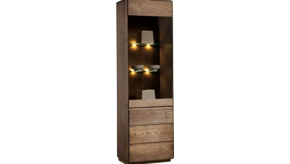 Jedną z propozycji jest witryna wąska – idealna do wyeksponowania zastawy, pamiątek lub ozdób. Prezentowana wersja to opcja węższa. W skład kolekcji wchodzą witryny, komody, szafki RTV, regały, łózko, stoły oraz krzesła, dzięki temu możemy stworzyć wymarzony zestaw mebli zarówno do salonu, jadalni, biura jaki i sypialni. Kolekcja Atlanta dzięki mnogości brył zdecydowanie jest bardzo uniwersalną propozycją.
