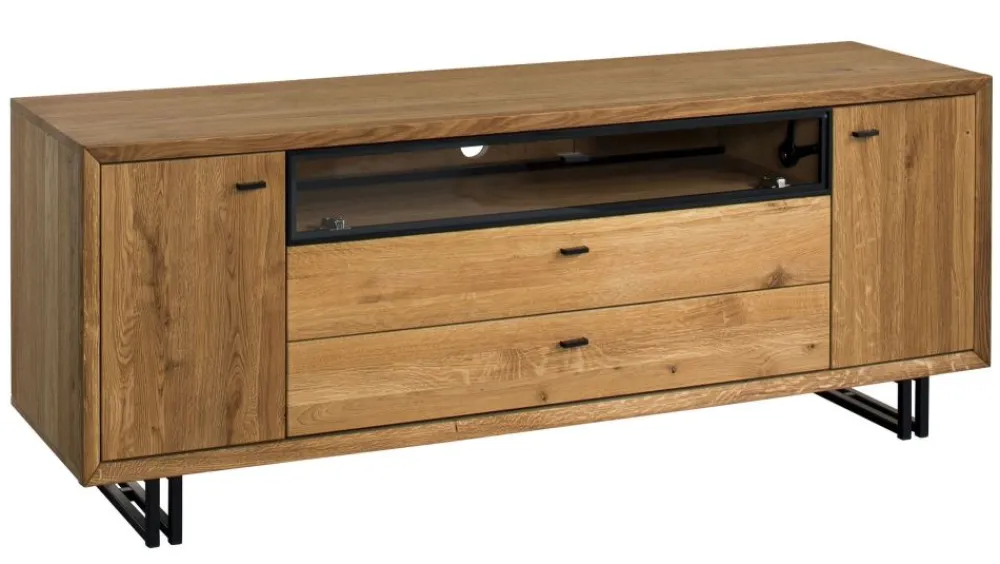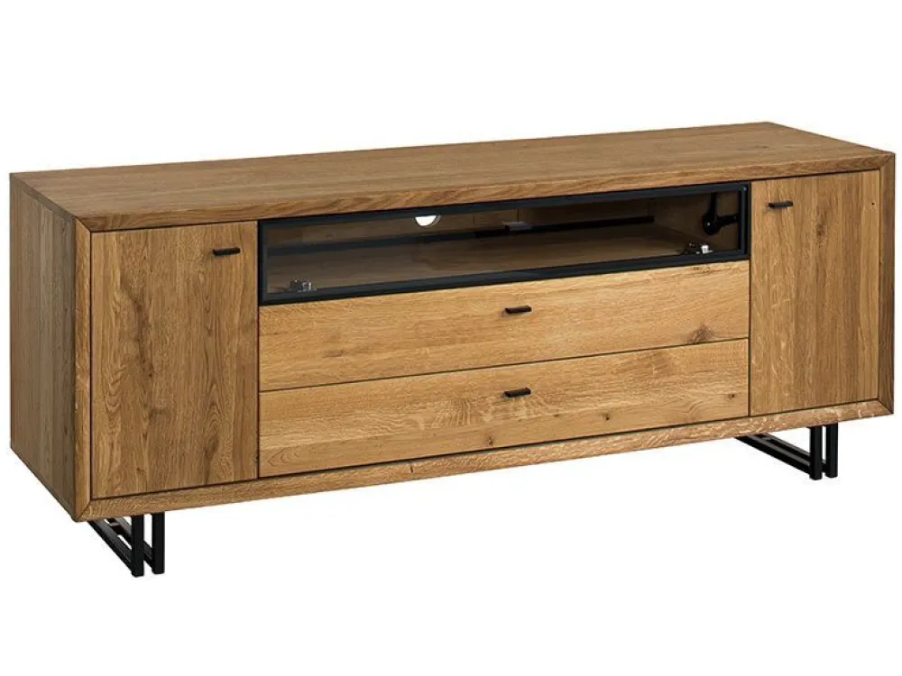 Jedną z propozycji kolekcji Vigo są szafki RTV. Prezentowany model to wersja większa, na czarnych, metalowych nóżkach. Szafka posiada specjalnie przygotowane przepusty na przewody oraz półkę za przezroczystą osłoną na sprzęt współpracujący z telewizorem. Ten element kolekcji, będzie stanowić doskonałe uzupełnienie aranżacji wnętrza. W ofercie dostępna jest również prosta półka wisząca oraz otwarty regał stojący. W skład kolekcji wchodzą witryny, komody, szafka RTV, regały oraz stolik, dzięki temu możemy stworzyć wymarzony zestaw mebli zarówno do salonu, jak i jadalni.