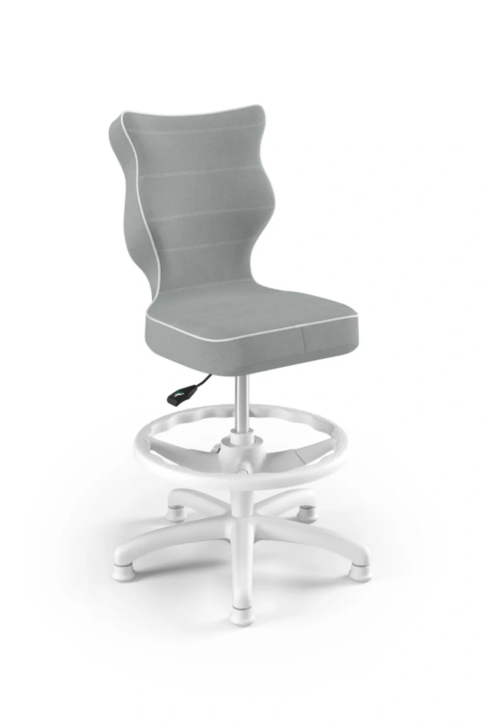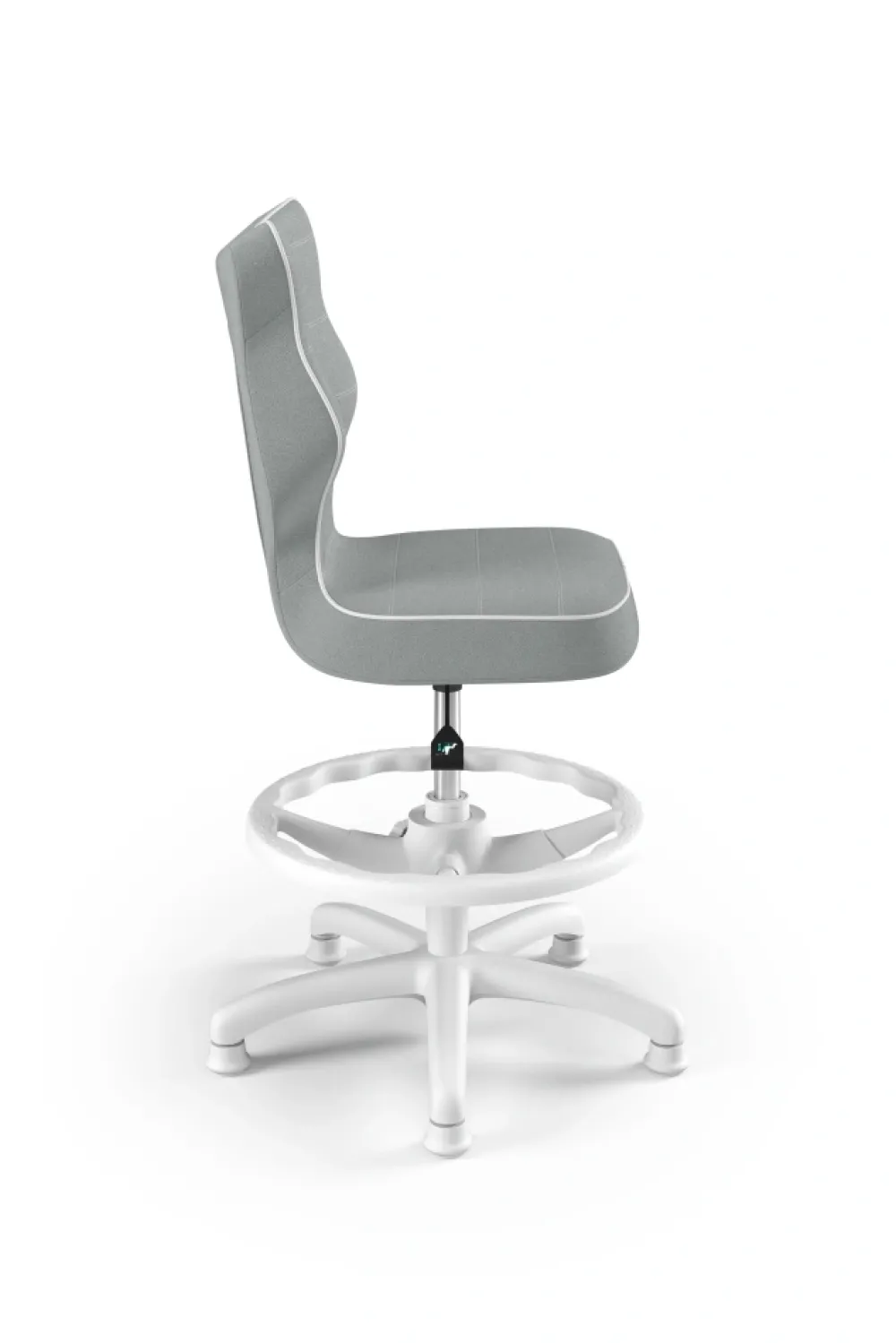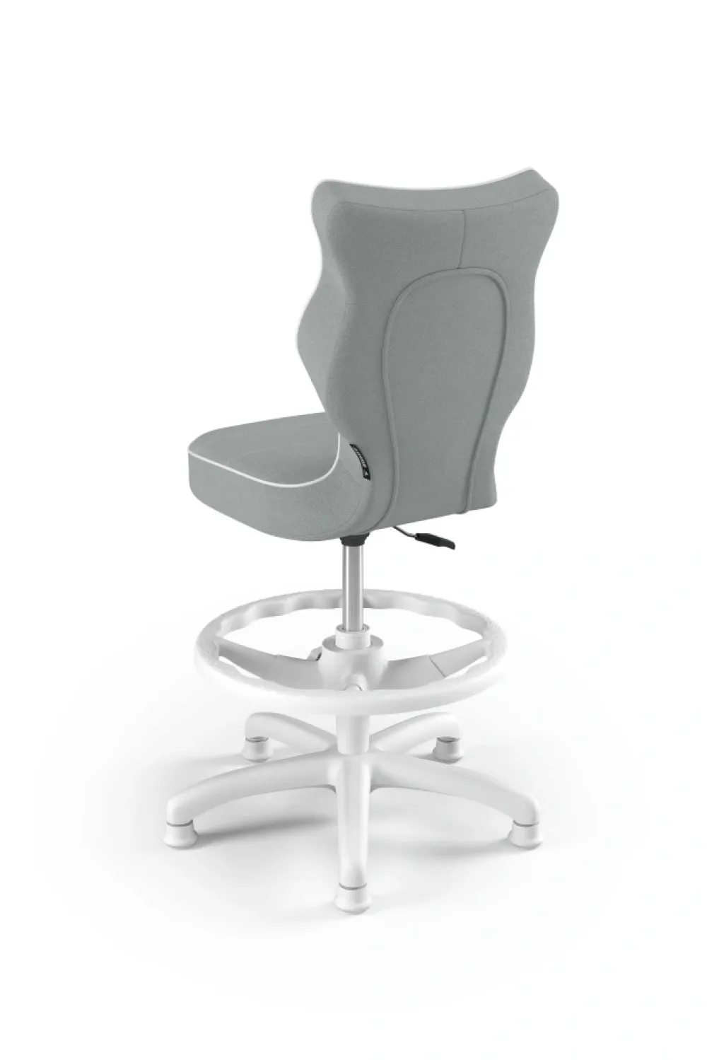 Petit to kolekcja krzeseł dziecięco-młodzieżowych o ergonomicznym kształcie siedziska dostosowanym do wzrostu użytkownika. Petit występuje w sześciu rodzajach tkanin, do których został przypisany określony sposób wykończenia krzesła. Model dostępny w czterech rozmiarach i w trzech kolorach komponentów – czarnym, białym oraz szarym. Podstawę krzesła wykonano z tworzywa sztucznego i włókna szklanego. W zestawie znajdują się kółka miękkie umożliwiające ruch krzesła zarówno po powierzchniach twardych jak i wykładzinach. Produkt zaprojektowany i wyprodukowany w Polsce. Wzrost użytkownika, rozmiar 3: 119 – 142 cm Wzrost użytkownika, rozmiar 4: 133 – 159 cm Wzrost użytkownika, rozmiar 5: 146 – 176,5 cm Wzrost użytkownika, rozmiar 6: 159 – 188 cm Wysokość blatu biurka Rozmiar 3-4 – wysokość biurka 63 – 69 cm Rozmiar 5-6 – wysokość biurka 70 – 82 cm Siedzisko: Ergonomiczne siedzisko wykonane z tworzywa sztucznego Mechanizm: Blacha siedziska z dźwignią prostą wykonana ze stali Osłonka: Teleskopowa osłonka na podnośnik gazowy wykonana z tworzywa sztucznego Wersje kolorystyczne: biała Baza: Podstawa pięcioramienna wykonana z tworzywa sztucznego i włókna szklanego Wersje kolorystyczne: biała Kółka: Kółka miękkie wykonane z tworzywa sztucznego, średnica 50 mm, średnica trzpienia fi 11 Wersje kolorystyczne: biała