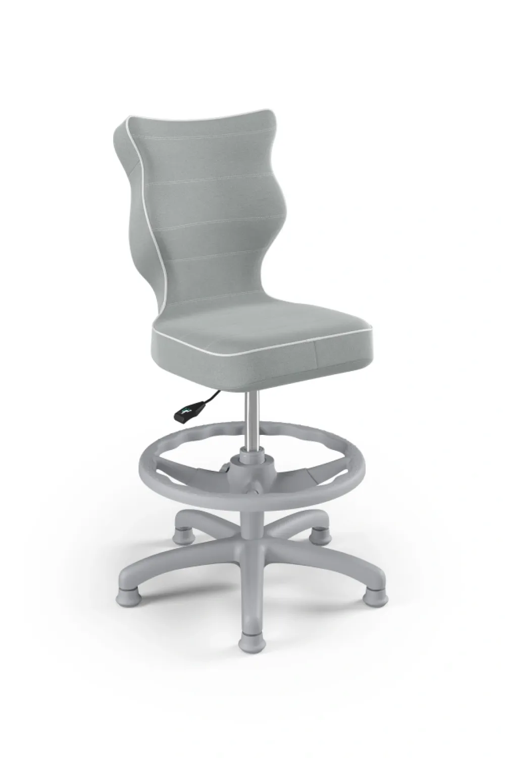 Petit to kolekcja krzeseł dziecięco-młodzieżowych o ergonomicznym kształcie siedziska dostosowanym do wzrostu użytkownika. Petit występuje w sześciu rodzajach tkanin, do których został przypisany określony sposób wykończenia krzesła. Model dostępny w czterech rozmiarach i w trzech kolorach komponentów – czarnym, białym oraz szarym. Podstawę krzesła wykonano z tworzywa sztucznego i włókna szklanego. W zestawie znajdują się kółka miękkie umożliwiające ruch krzesła zarówno po powierzchniach twardych jak i wykładzinach. Produkt zaprojektowany i wyprodukowany w Polsce. Wzrost użytkownika, rozmiar 3: 119 – 142 cm Wzrost użytkownika, rozmiar 4: 133 – 159 cm Wzrost użytkownika, rozmiar 5: 146 – 176,5 cm Wzrost użytkownika, rozmiar 6: 159 – 188 cm Wysokość blatu biurka Rozmiar 3-4 – wysokość biurka 63 – 69 cm Rozmiar 5-6 – wysokość biurka 70 – 82 cm Siedzisko: Ergonomiczne siedzisko wykonane z tworzywa sztucznego Mechanizm: Blacha siedziska z dźwignią prostą wykonana ze stali Osłonka: Teleskopowa osłonka na podnośnik gazowy wykonana z tworzywa sztucznego Wersje kolorystyczne: szara Baza: Podstawa pięcioramienna wykonana z tworzywa sztucznego i włókna szklanego Wersje kolorystyczne: szara Kółka: Kółka miękkie wykonane z tworzywa sztucznego, średnica 50 mm, średnica trzpienia fi 11 Wersje kolorystyczne: szara
