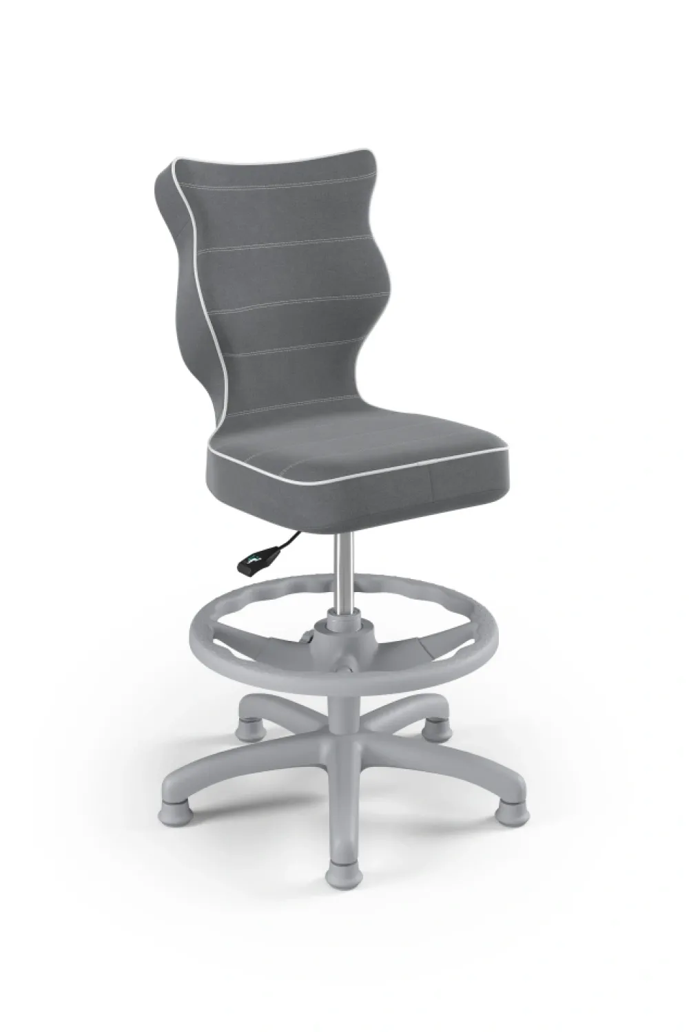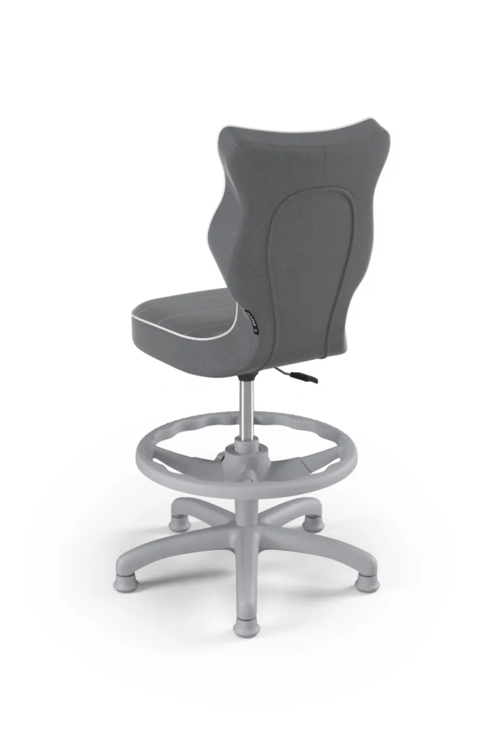 Petit to kolekcja krzeseł dziecięco-młodzieżowych o ergonomicznym kształcie siedziska dostosowanym do wzrostu użytkownika. Petit występuje w sześciu rodzajach tkanin, do których został przypisany określony sposób wykończenia krzesła. Model dostępny w czterech rozmiarach i w trzech kolorach komponentów – czarnym, białym oraz szarym. Podstawę krzesła wykonano z tworzywa sztucznego i włókna szklanego. W zestawie znajdują się kółka miękkie umożliwiające ruch krzesła zarówno po powierzchniach twardych jak i wykładzinach. Produkt zaprojektowany i wyprodukowany w Polsce. Wzrost użytkownika, rozmiar 3: 119 – 142 cm Wzrost użytkownika, rozmiar 4: 133 – 159 cm Wzrost użytkownika, rozmiar 5: 146 – 176,5 cm Wzrost użytkownika, rozmiar 6: 159 – 188 cm Wysokość blatu biurka Rozmiar 3-4 – wysokość biurka 63 – 69 cm Rozmiar 5-6 – wysokość biurka 70 – 82 cm Siedzisko: Ergonomiczne siedzisko wykonane z tworzywa sztucznego Mechanizm: Blacha siedziska z dźwignią prostą wykonana ze stali Osłonka: Teleskopowa osłonka na podnośnik gazowy wykonana z tworzywa sztucznego Wersje kolorystyczne: szara Baza: Podstawa pięcioramienna wykonana z tworzywa sztucznego i włókna szklanego Wersje kolorystyczne: szara Kółka: Kółka miękkie wykonane z tworzywa sztucznego, średnica 50 mm, średnica trzpienia fi 11 Wersje kolorystyczne: szara
