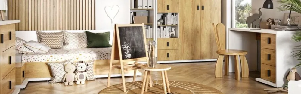 Kolekcja SIMI to nowoczesna propozycja charakteryzująca się połączeniem bieli alpejskiej z kolorem drewna. Ponadczasowa stylistyka mebli gwarantuje ich użytkowanie od lat dziecięcych, po późno szkolne a nawet dla dorosłych. Kształt mebli wpisuje się w dzisiejszy design i z pewnością odnajdzie się w aranżacjach nowoczesnych oraz skandynawskich tworząc przytulne wnętrze.
