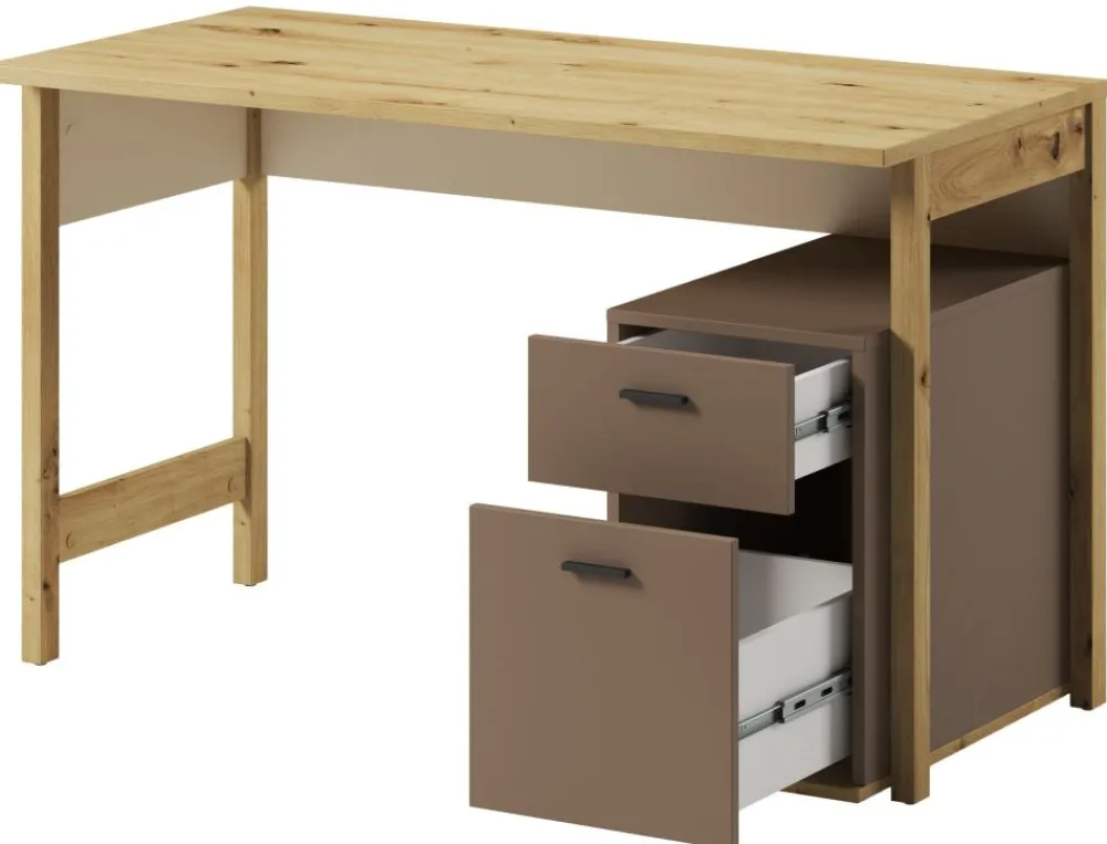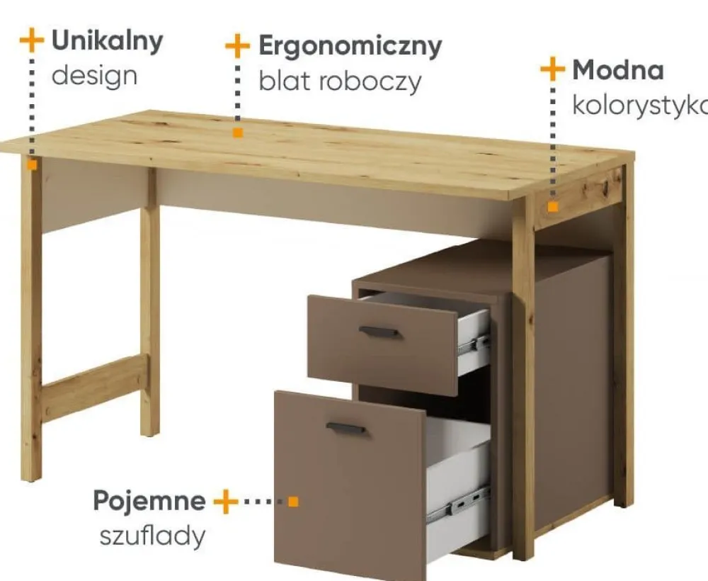 Doskonały mebel, który łączy w sobie funkcjonalność, styl i elegancję. To niezwykle praktyczne biurko zostało zaprojektowane z myślą o potrzebach młodych uczniów, a jego subtelne połączenie kolorów beżowego, truflowego i dekoru w kolorze dąb artisan sprawia, że świetnie komponuje się zarówno w pokojach dziewczynek, jak i chłopców, bez względu na ich wiek.