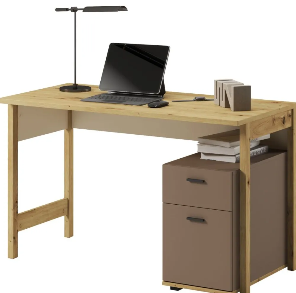 Jego uniwersalny design sprawia, że biurko LENNY idealnie wpasuje się w różnorodne style wystroju wnętrz, umożliwiając łatwe dopasowanie do pozostałych mebli w pokoju. Kolor beżowy nadaje meblowi delikatności i subtelności, truflowy dodaje nutę elegancji, zaś dekor w kolorze dąb artisan nadaje mu naturalnego uroku.